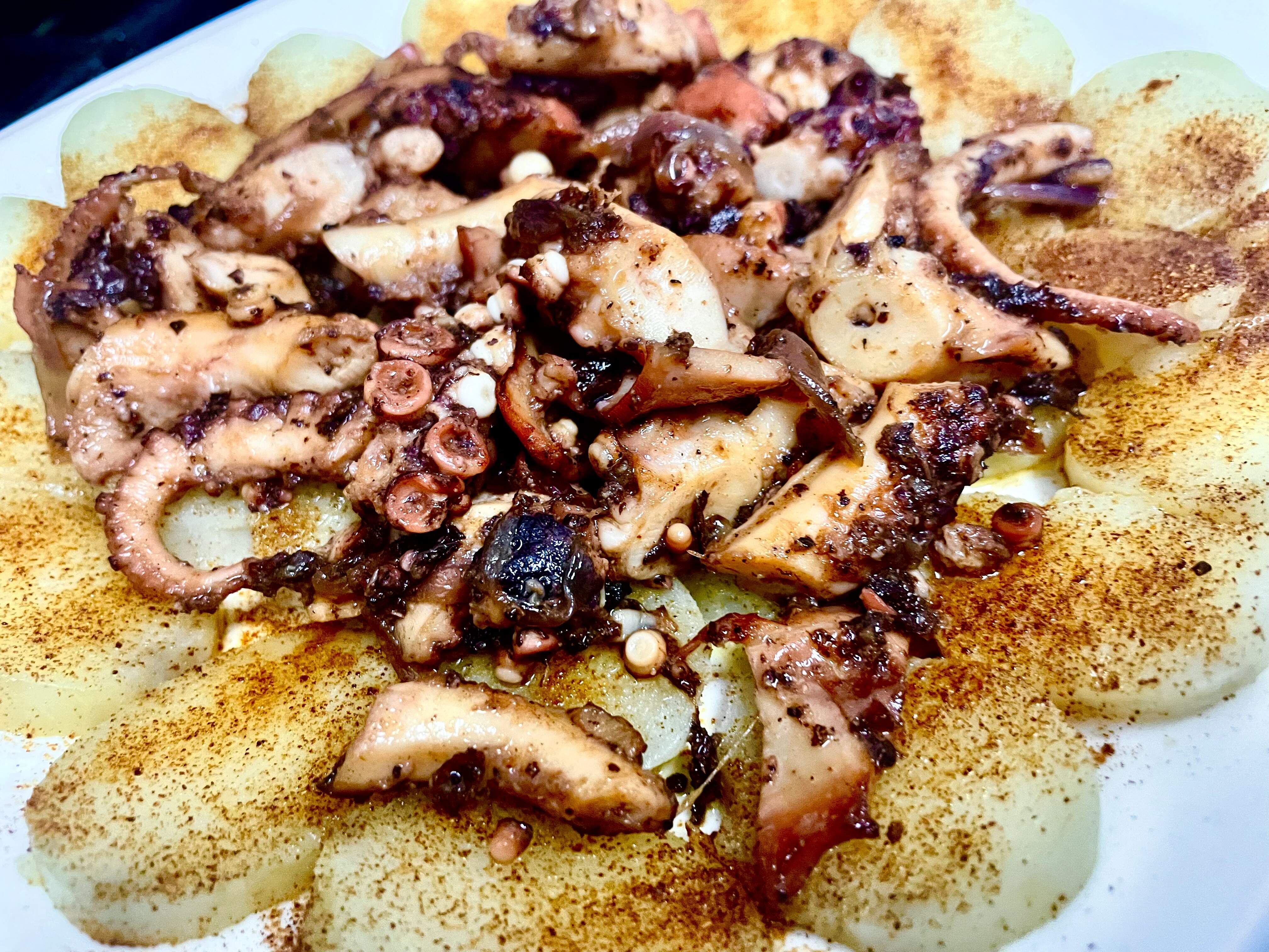 I ate the same dish a few days later at a Basque restaurant, and they had tenderized the octopus much more than I’ve encountered before, so I may push it a bit further next time.