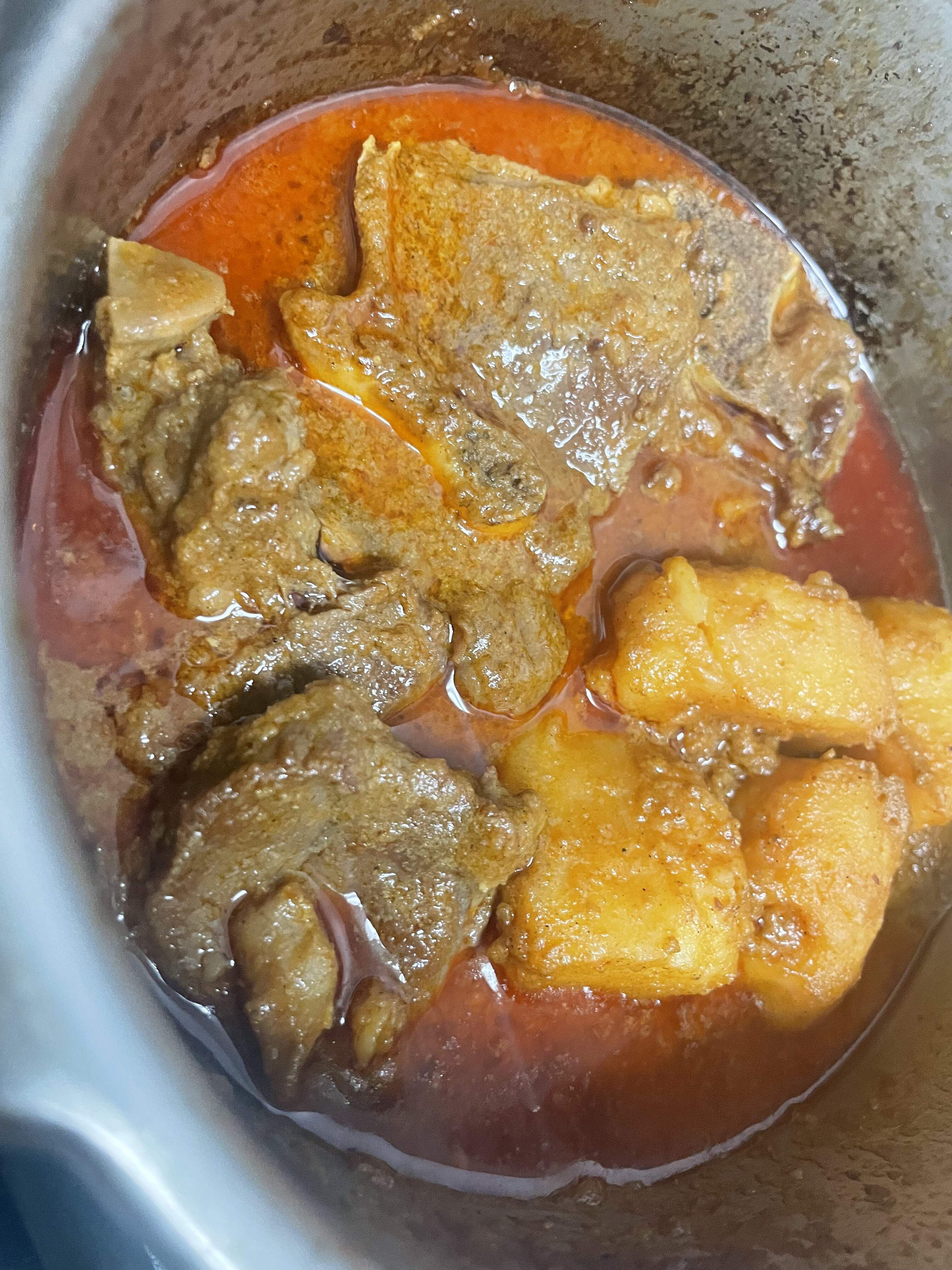 I used a blend of rendang paste, red curry paste, and panang curry paste instead of massaman, shoulder lamb chops, and coconut cream, and cooked everything in the pressure cooker to speed up tenderizing the meat.