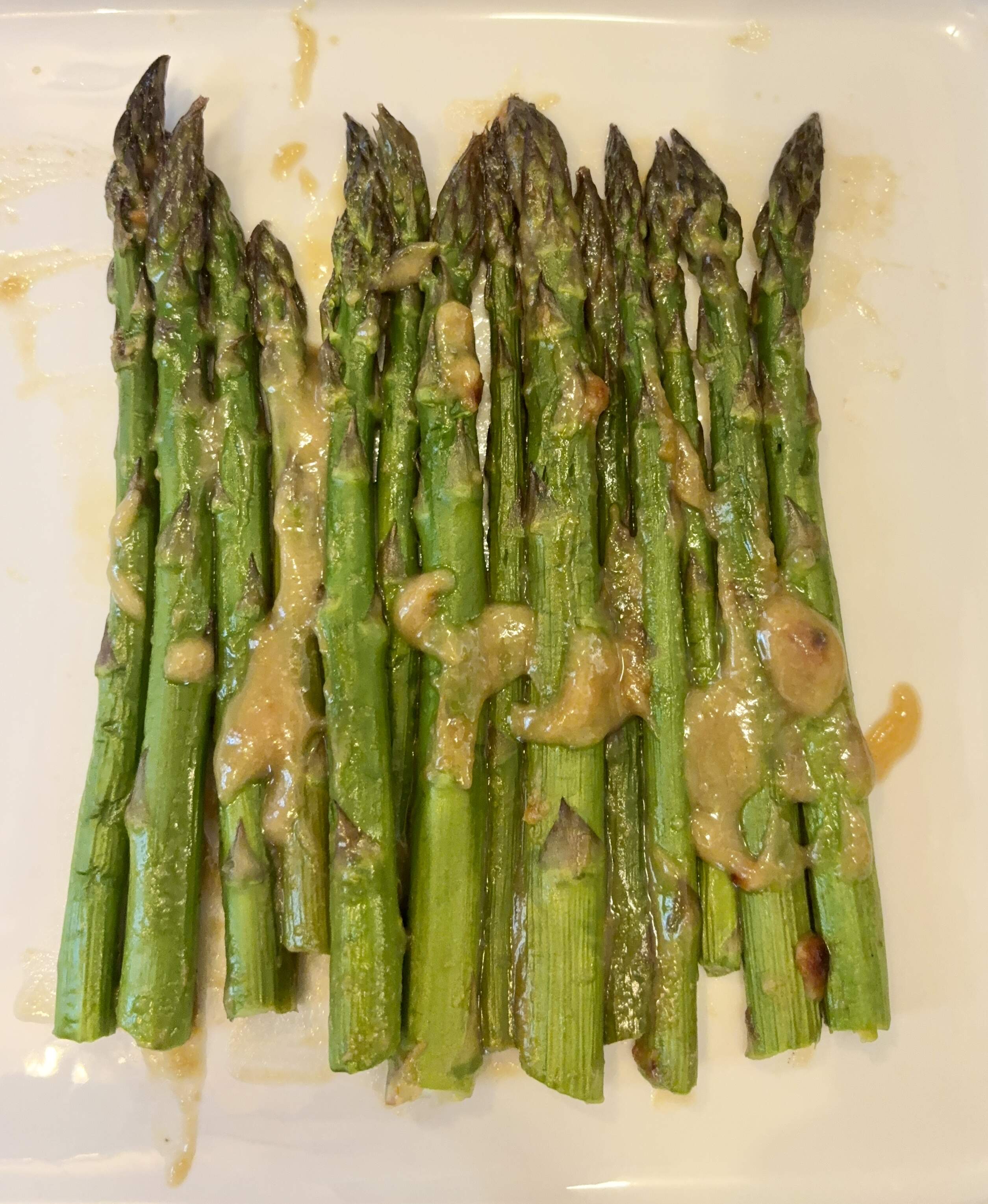 Asparagus is fresh and great at the local farmers’ markets right now, so I’m eating as much as I can while it’s in season. For this simple prep, Andres was inspired by Nobu’s miso cod. I think the recipe as written, with 2 T. sugar for one bunch of asparagus, reads as really sweet even taking into account the saltiness of miso. I made a couple of changes to the miso mixture: probably closer to 3 T. white miso than 1/4 cup, which would be 4; instead of 1/4 cup hot water, I used 2 T. mirin and 2 T. hot water, and instead of the aforementioned 2 T. sugar, I used about 2 tsp. maple syrup (picking up on the suggestion in the note at the end, though that suggests adding honey or maple syrup in addition to all the sugar). My miso mixture wasn’t “bubbling” by the time the asparagus was done, and I didn’t want it to get overdone. I broiled it in my countertop oven, and it’s possible my wall oven’s broiler would handle this better.