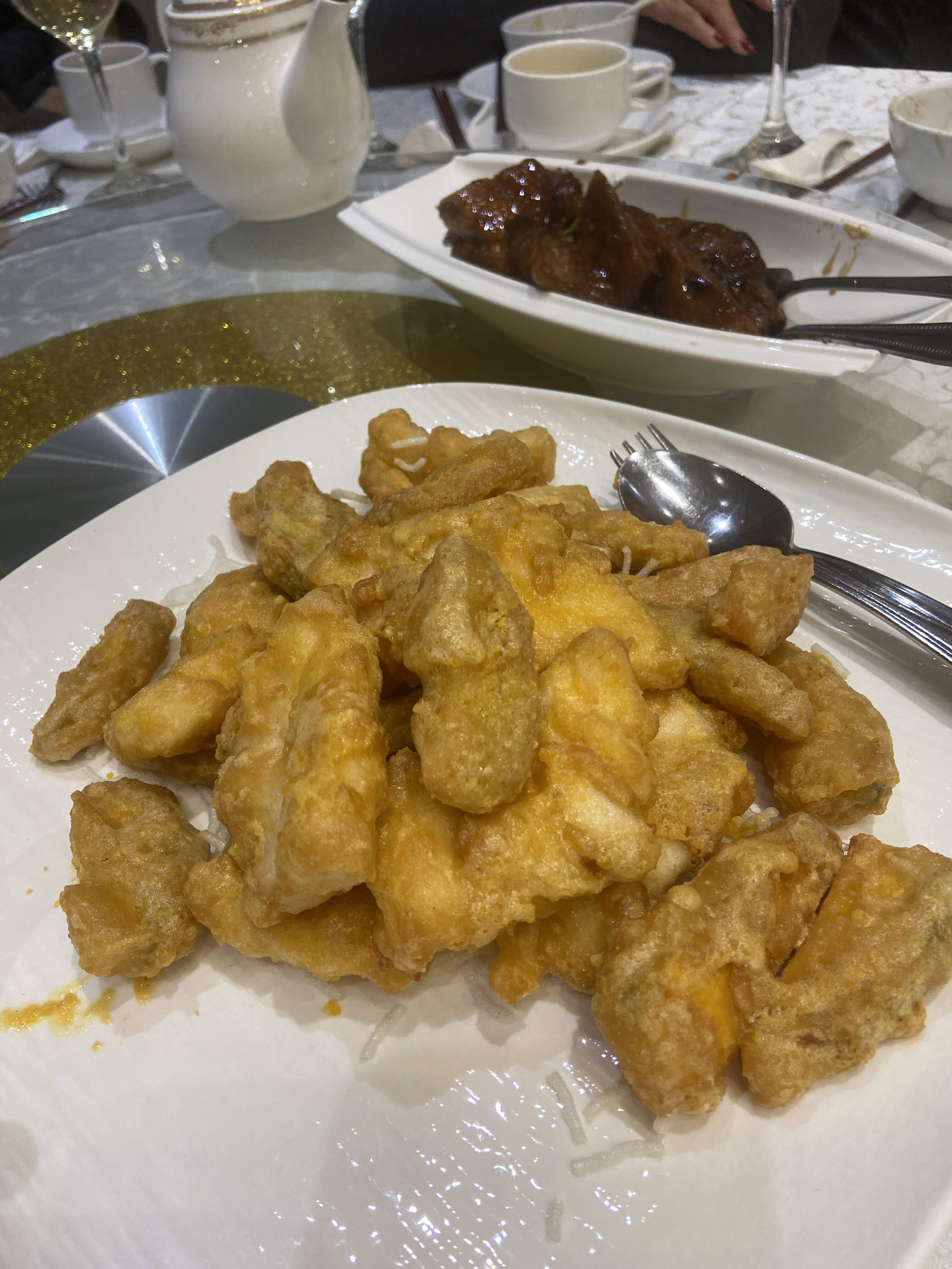 Deep fried Ocean Yellow-Fin Grouper filet and Pumpkin slices with salted duck egg yolk batter coating. ( How can one go wrong with deep fried dishes that were finished off with salted duck egg yolk as a coating?! Perfectly cooked, the plump, delicate and sweet fish inside the savory, salty and crunchy shell was moist and juicy, a perfect textural combination )