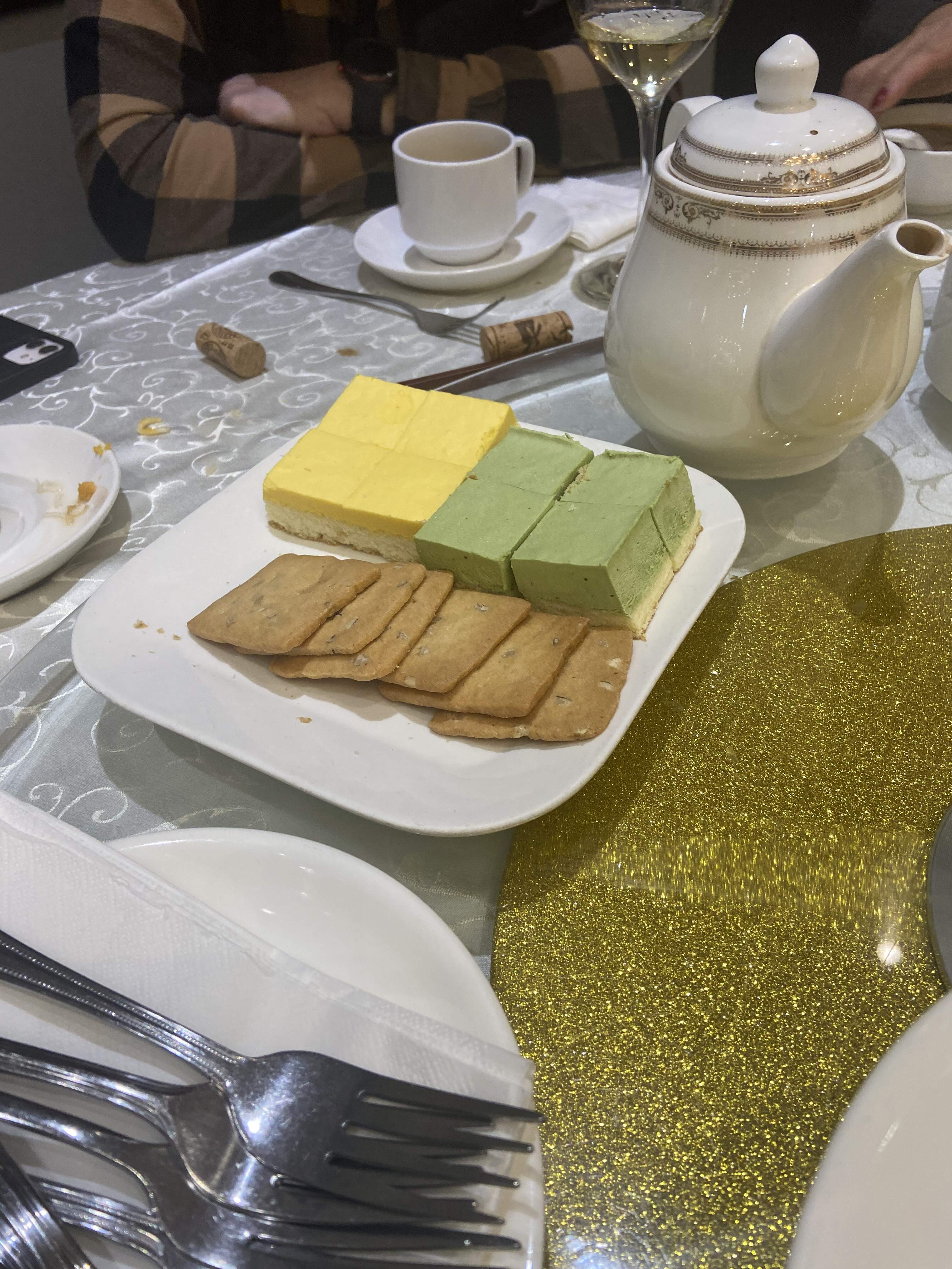 Complimentary desserts of Mango and Matcha sponge cake, Almond butter cookies and Mung Bean and Kombu Seaweed Dessert Soup.