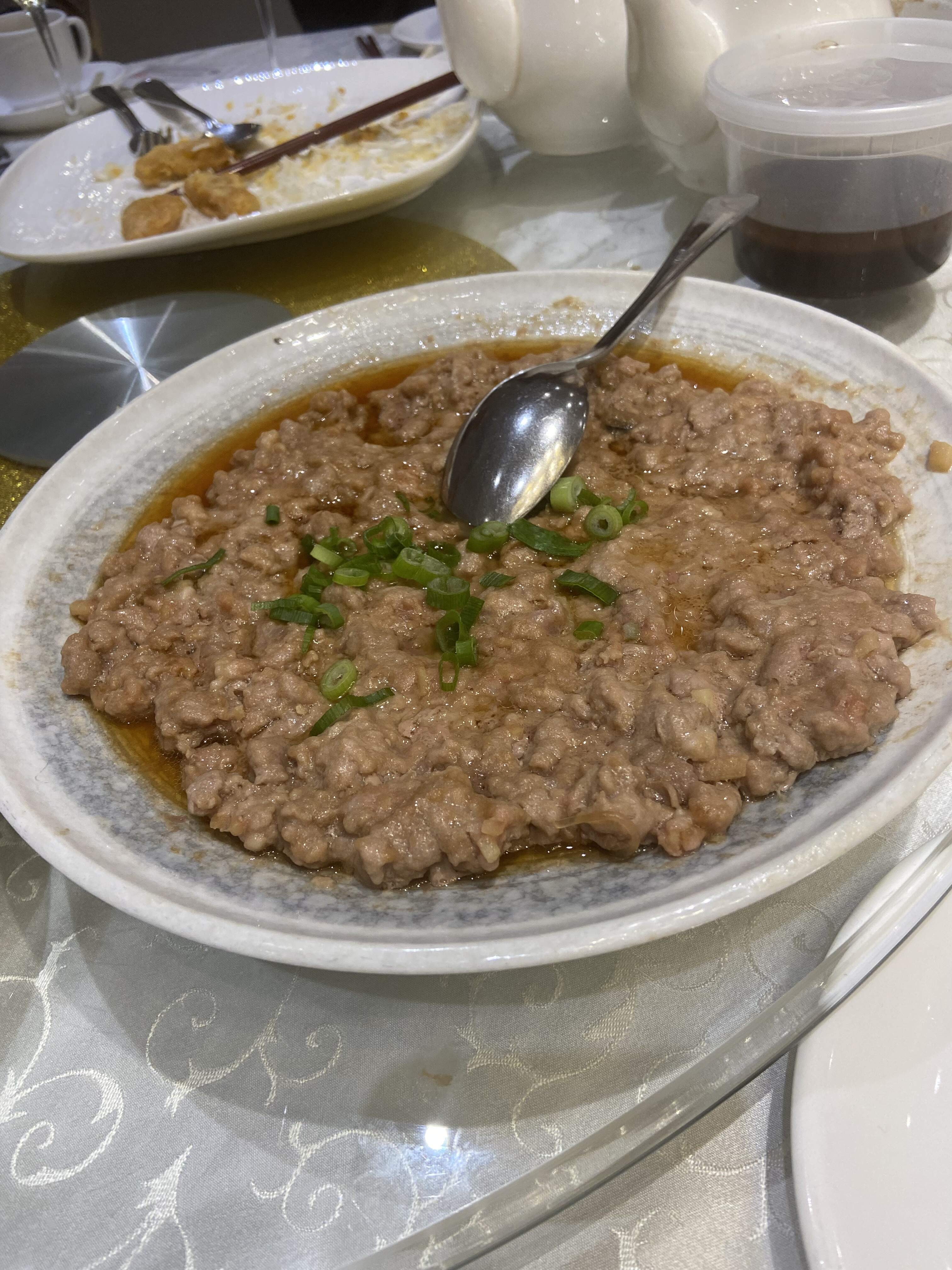 - Steamed minced pork patties with preserved salted fish ( made famous by the now defunct O’Mei. This reproduction possessed the correct consistency and texture but was sadly under-seasoned. Result from the chef skimming on the priced salted fish components? )
