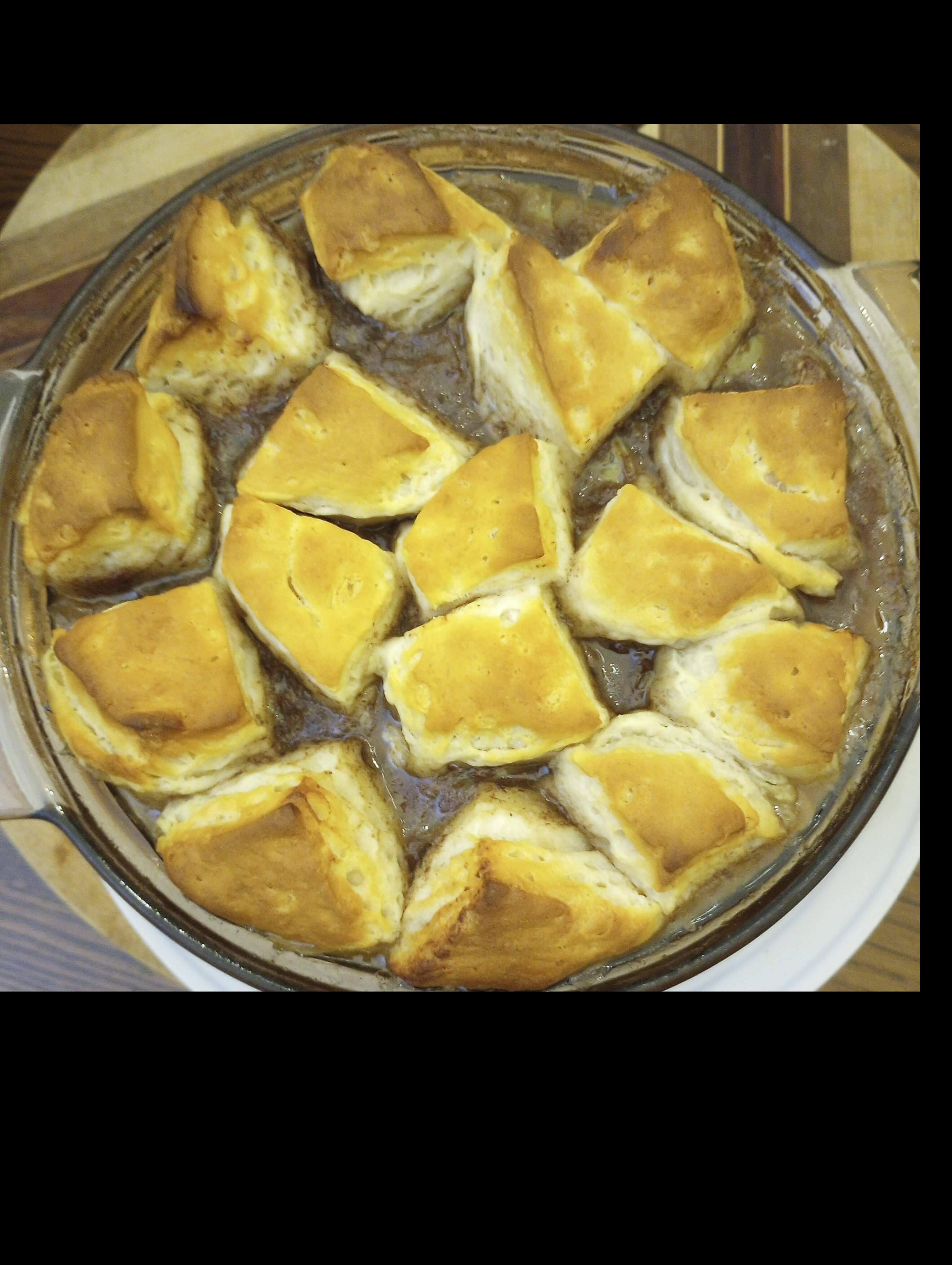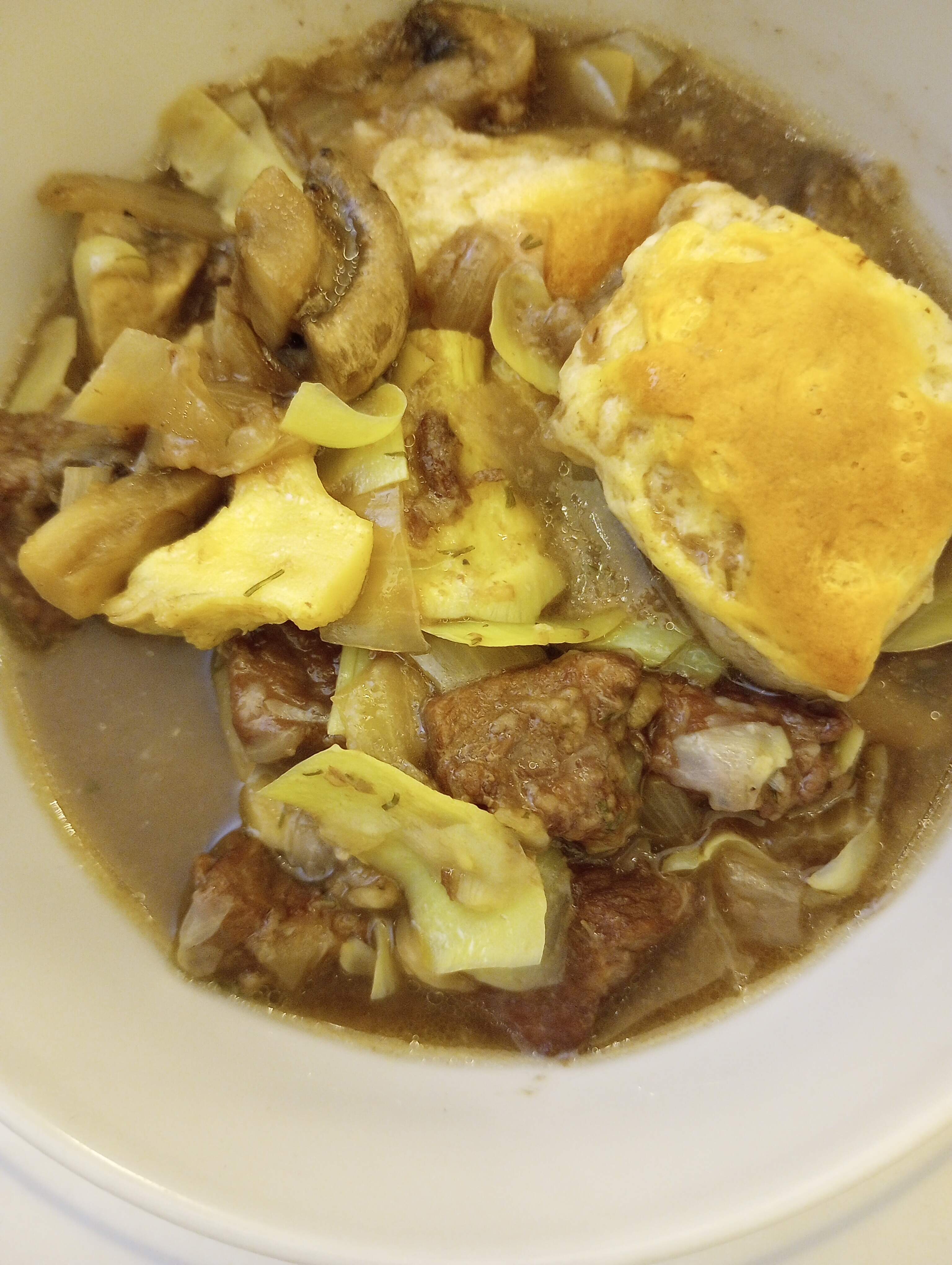 Truckadero Beef Stew - a recipe from the 1980’s featuring artichoke hearts and mushrooms, with a biscuit topping. I make my version with half the beef (1 pound), and twice the broth (20 oz total) and dried dill (1 tsp). The old fashioned small refrigerator biscuits aren’t available where I shop, just Grands size. I cut 4 of those into quarters to scatter on top of the stew for the final bake, and bake the other 4 beside it. With a BIG note-to-self that the biscuits baked separately need only half the time of those topping the stew - watch closely.