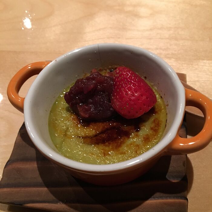 Dessert was a little green tea crème brûleé filled with an azuki paste and strawberry. Very nice.