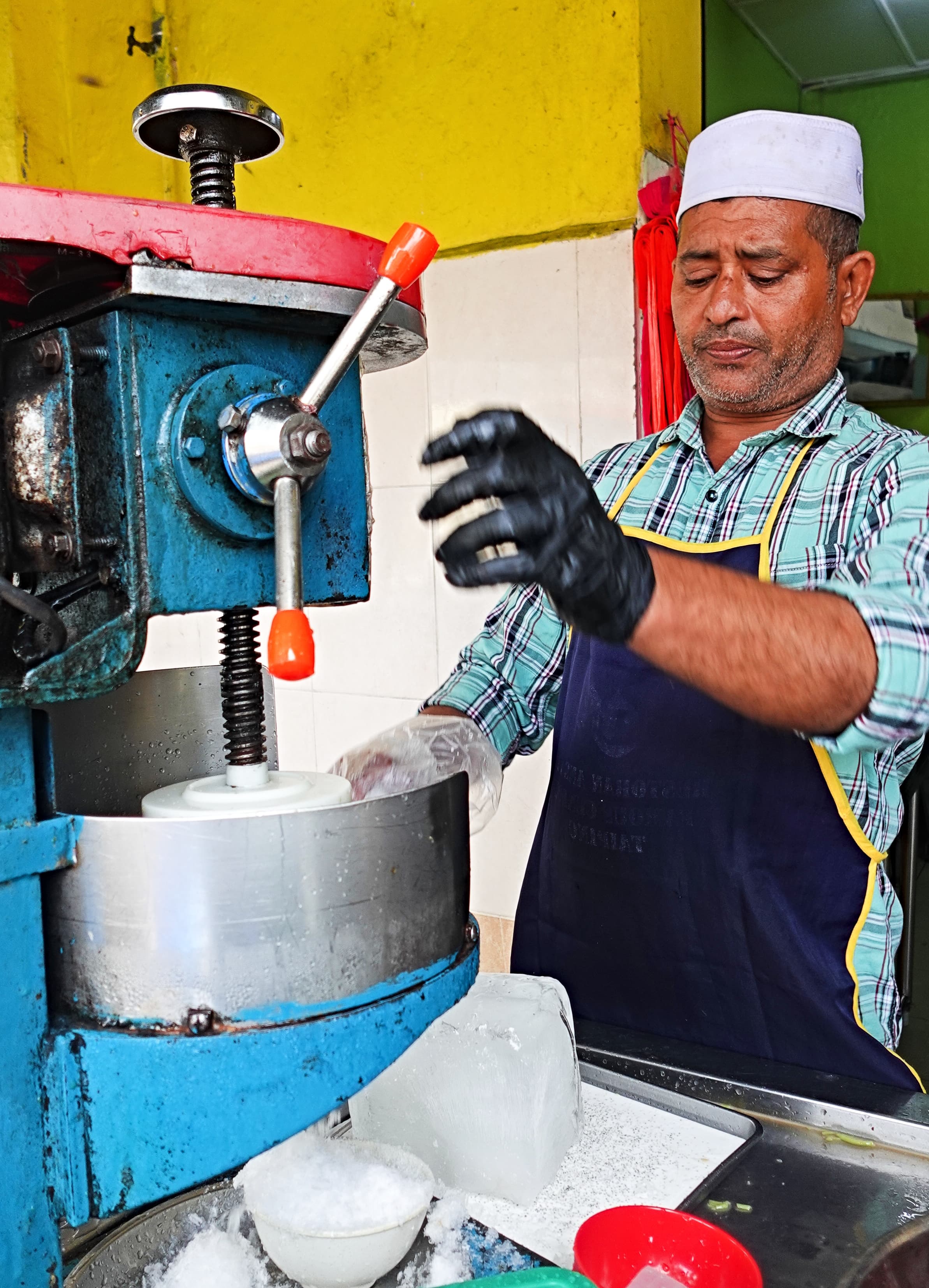 Shaving the ice into a bowl of green pandan-flavored /green-hued noodles using one of the decades-old ice-shavers.