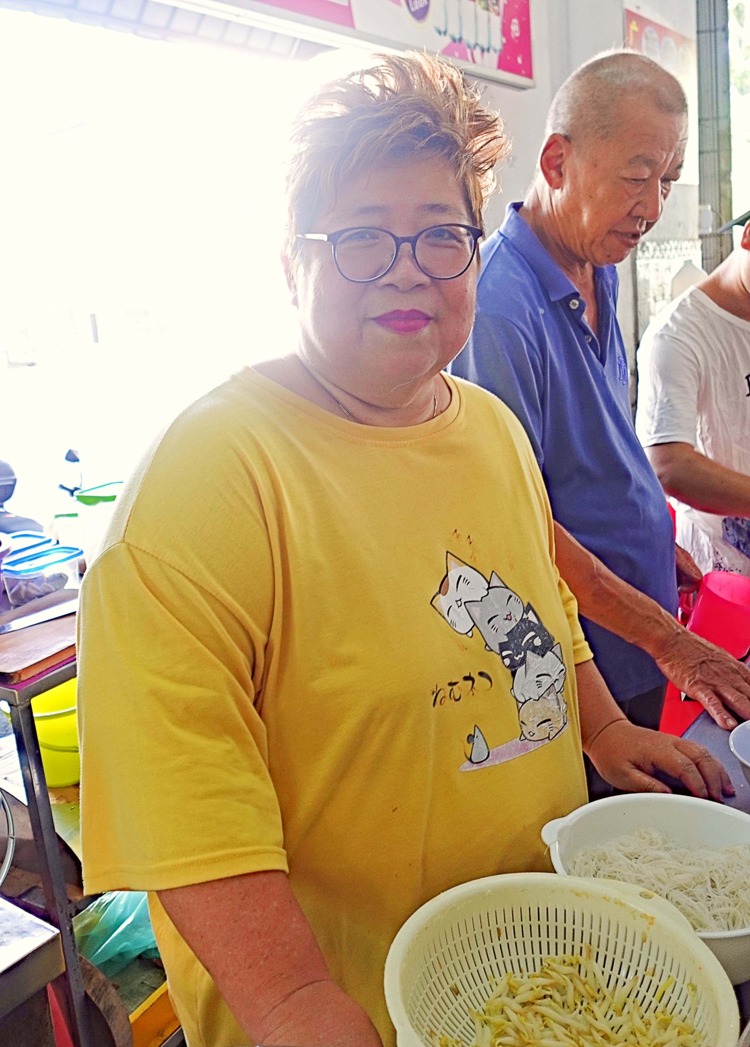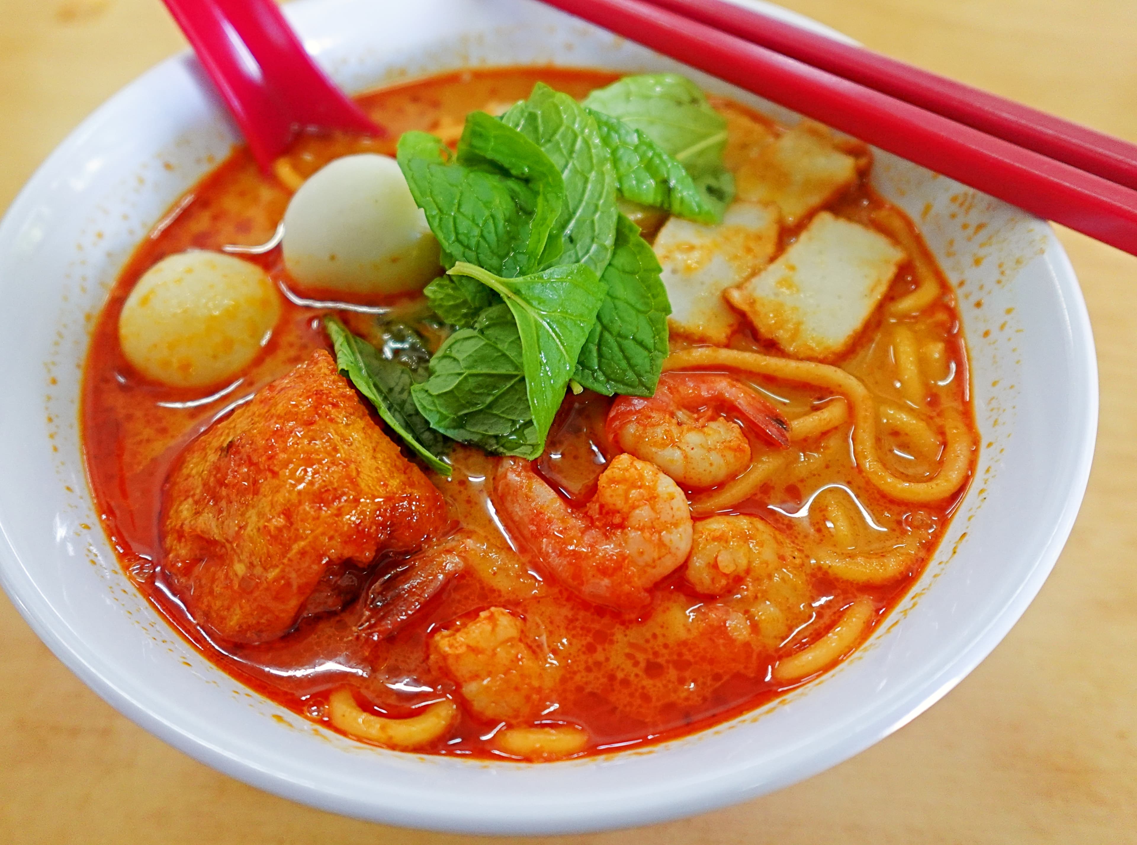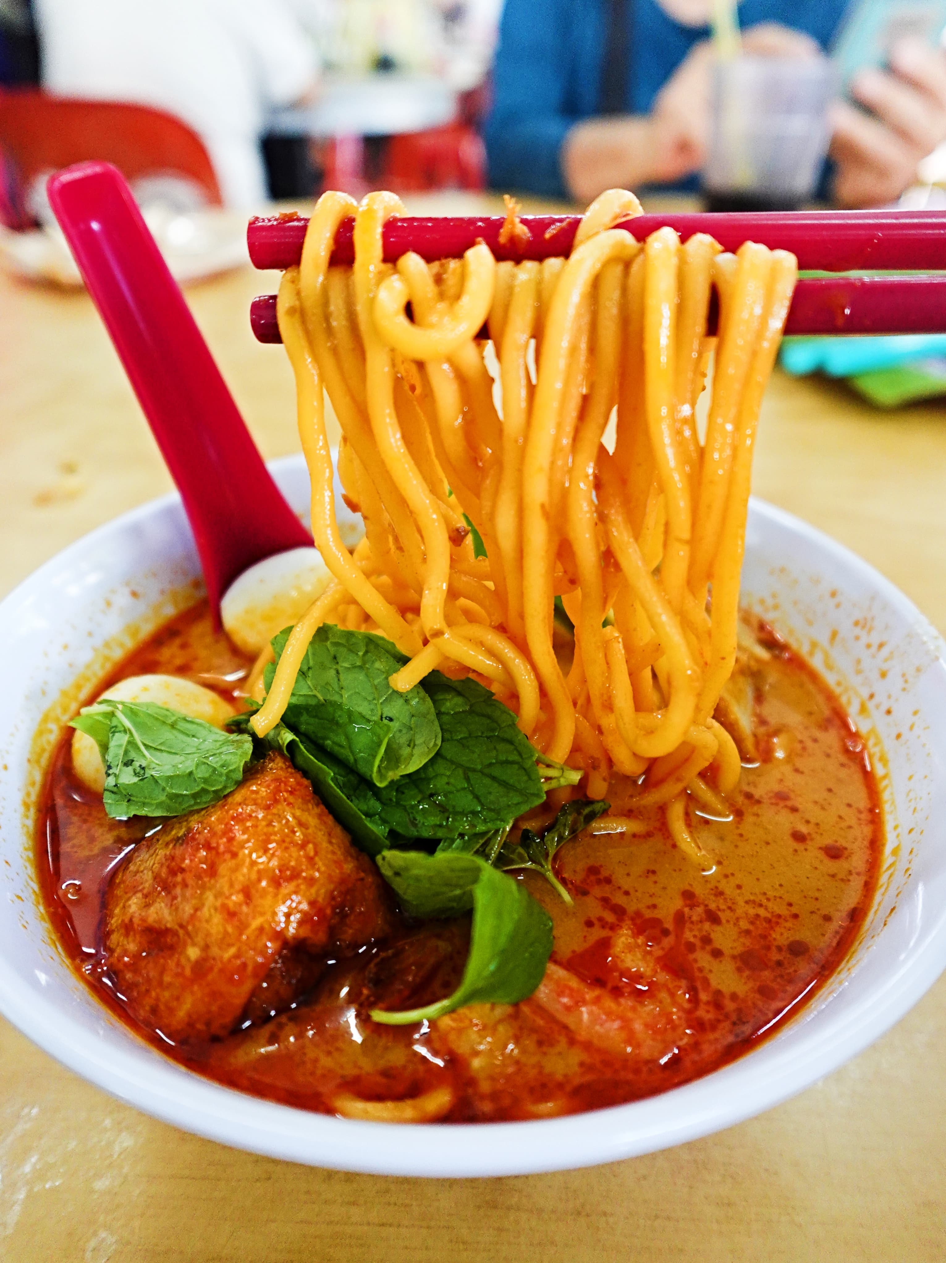 Her curried yellow Hokkien wheat noodles are garnished with curried chicken, shrimps, fish-balls and slivers of sliced fish-cake, topped with sprigs of fresh mint leaves.
