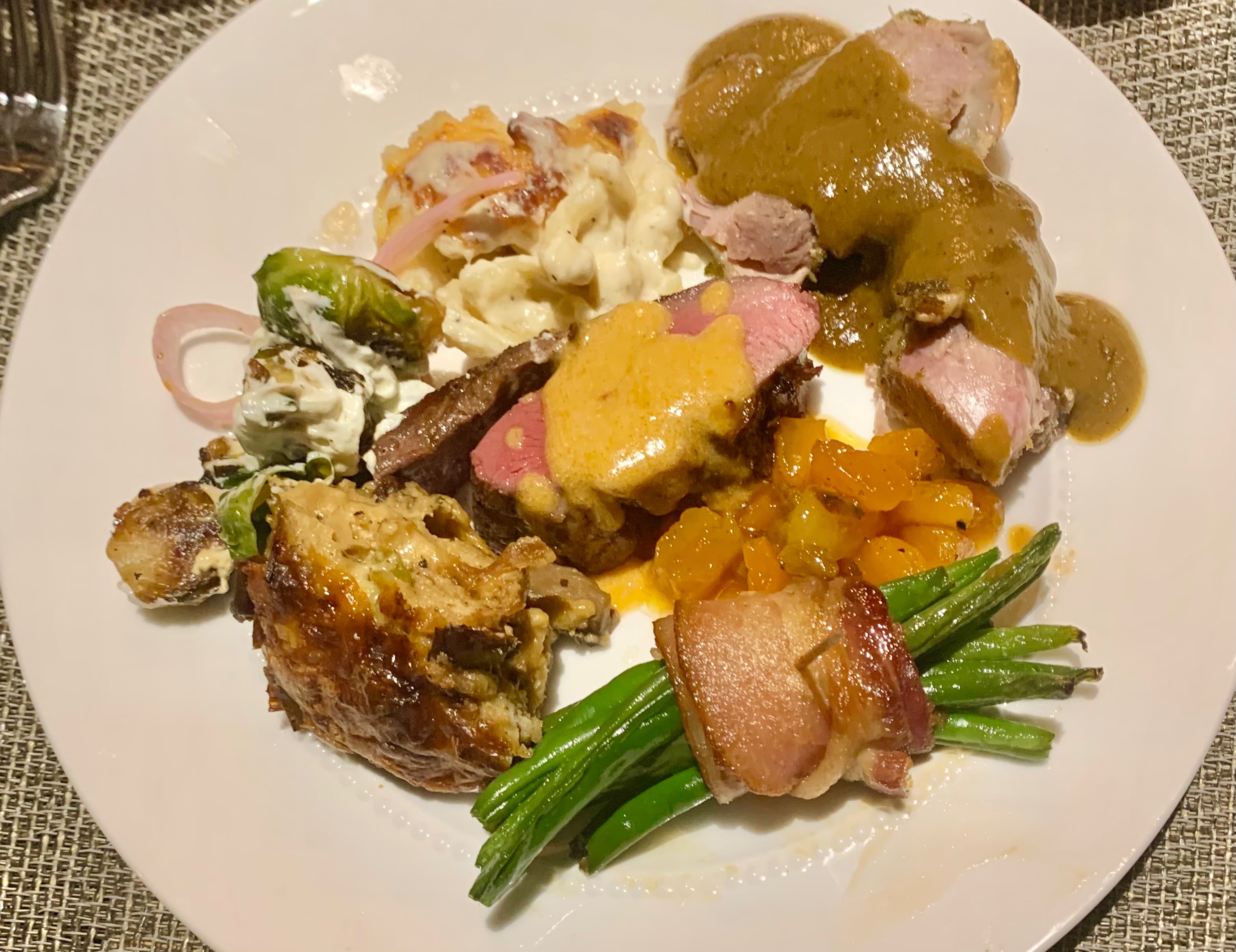 The mushroom and leek bread pudding and the mac and cheese both worked even better than I had hoped (the pasta in the mac was soaked but uncooked, and I had swapped the bread cubes in the bread pudding for stuffing cubes) and baked up gorgeous. The small sticky toffee pudding would have been better baked fresh, but despite everyone else being a pie eater, there were only two small pieces left (and I only tried half a piece to taste it).