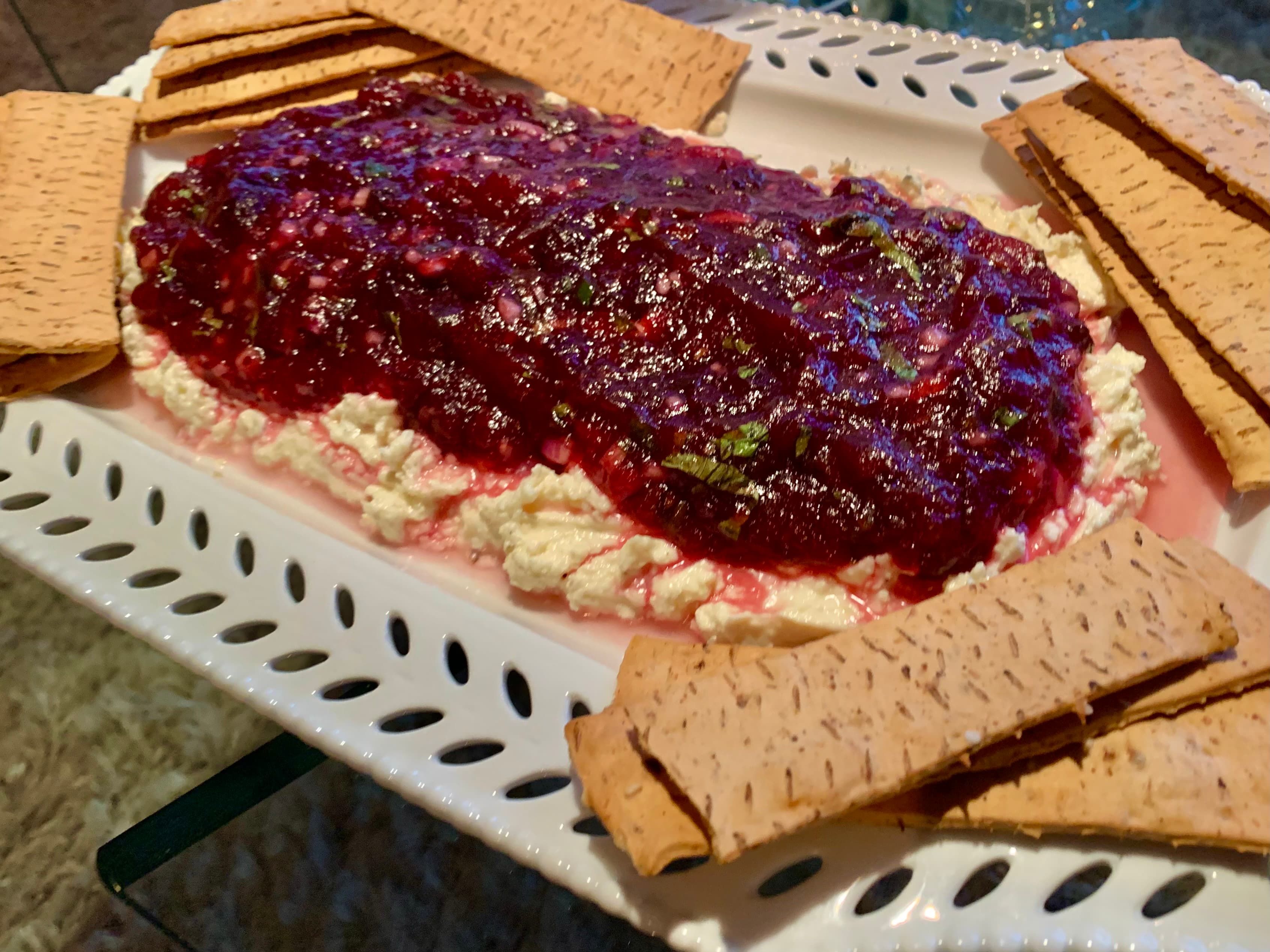 Homemade cheese dip with cranberry jalapeno salsa