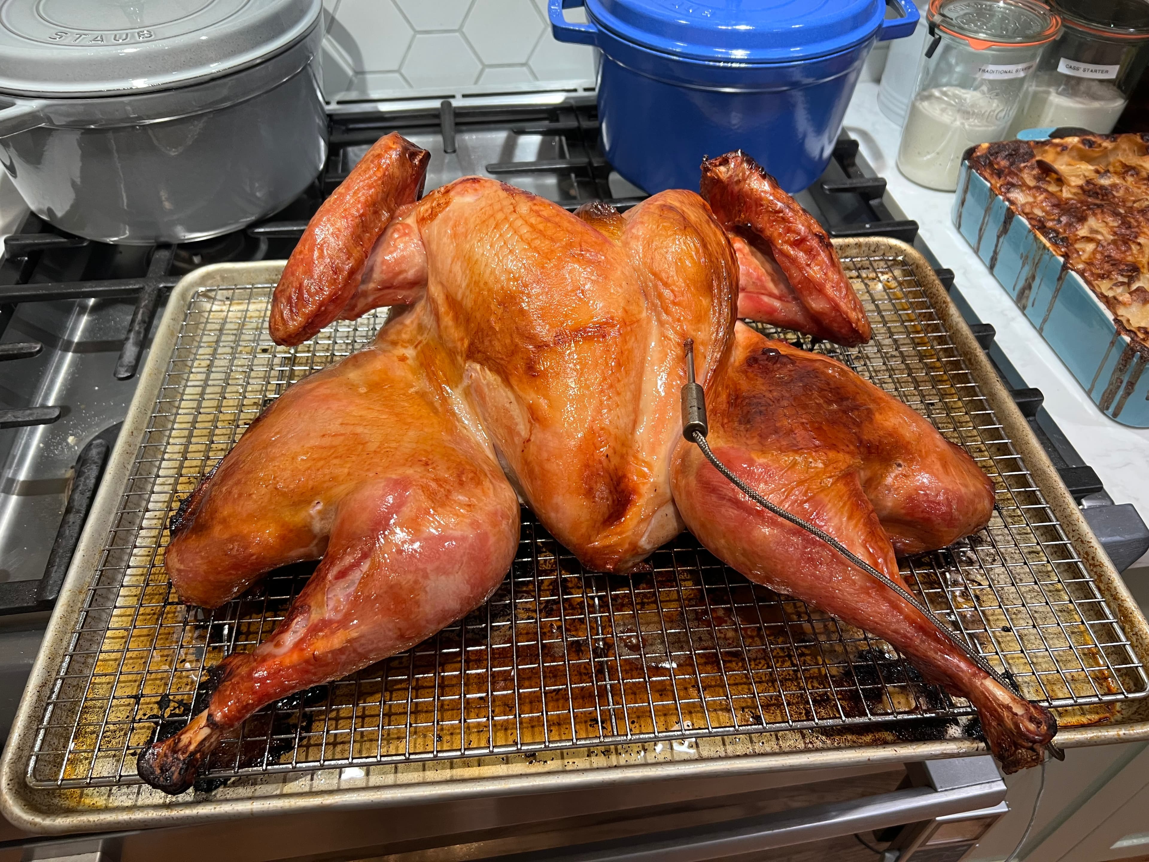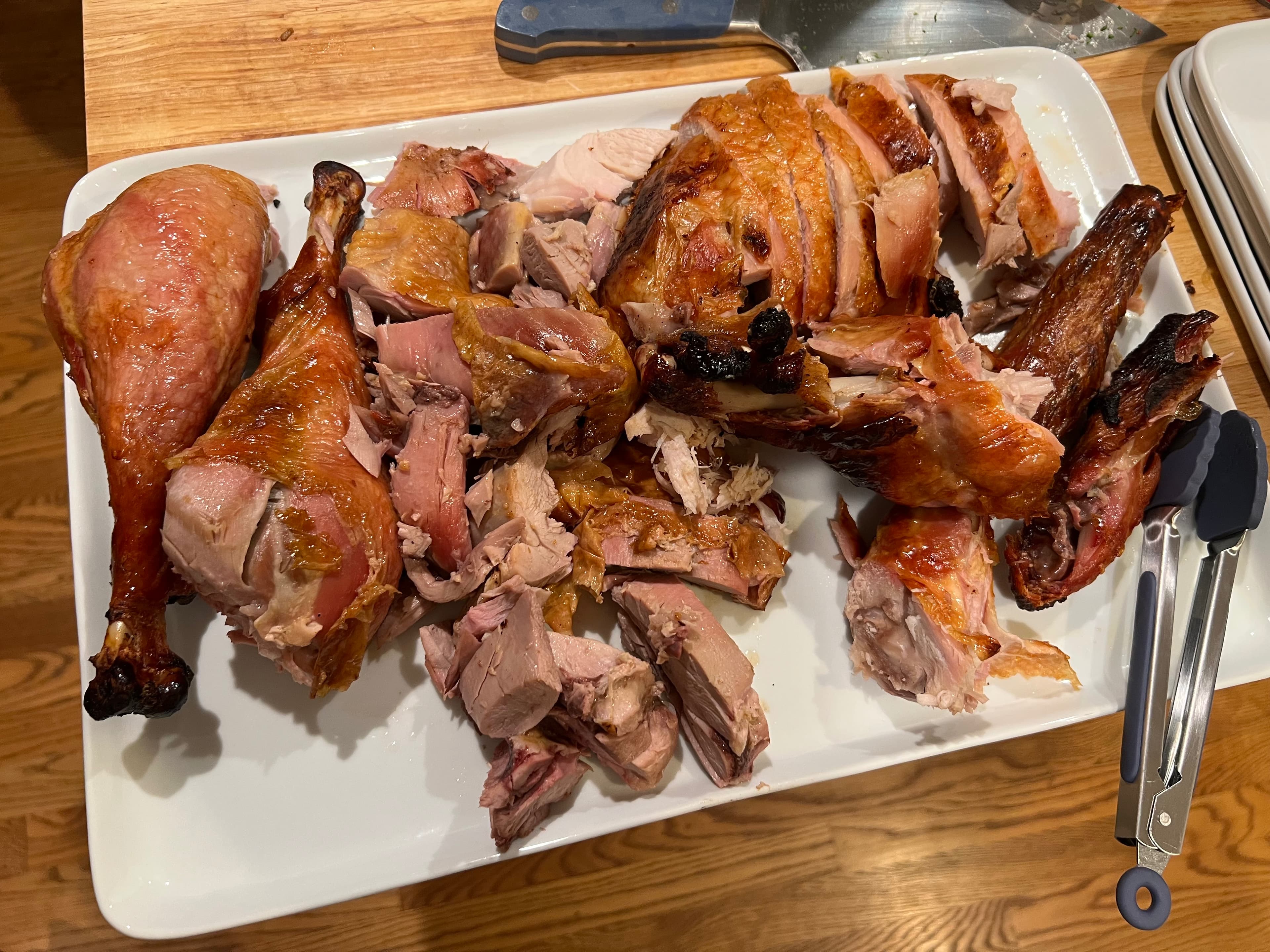 Happy Thanksgiving everyone! Today’s turkey was a pre brined and pre spatchcocked bird from Cream Co. in Oakland, CA via Goodeggs. I cut the legs out barely 40 minutes into cooking at 450F because they had come up to temp already. Left the breast in just a tad bit too long but it was still pretty good.