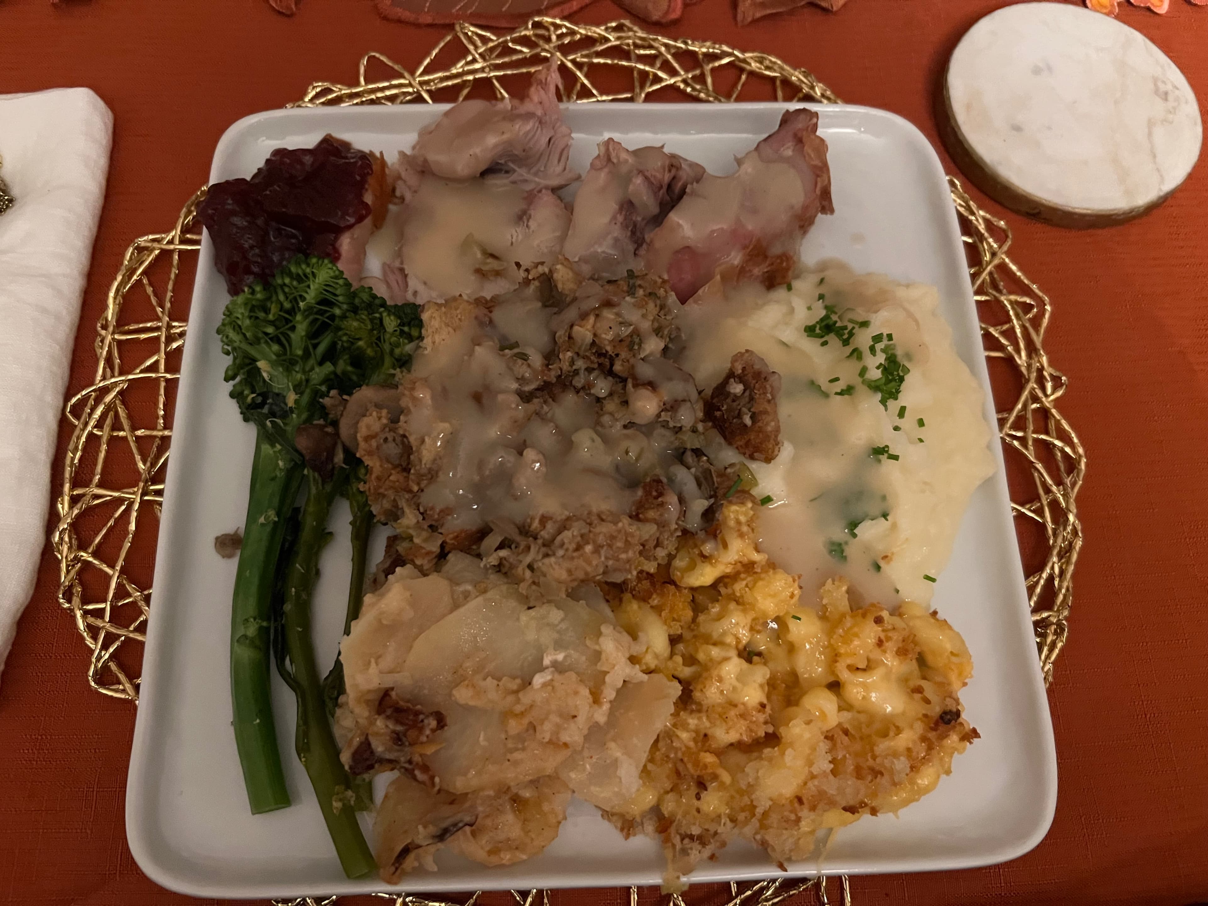 For sides we had mac and cheese, sausage and mushroom stuffing, broccolini, potatoes mashed and scalloped, turkey gravy, fresh baked bread, and cranberry sauce from a can.