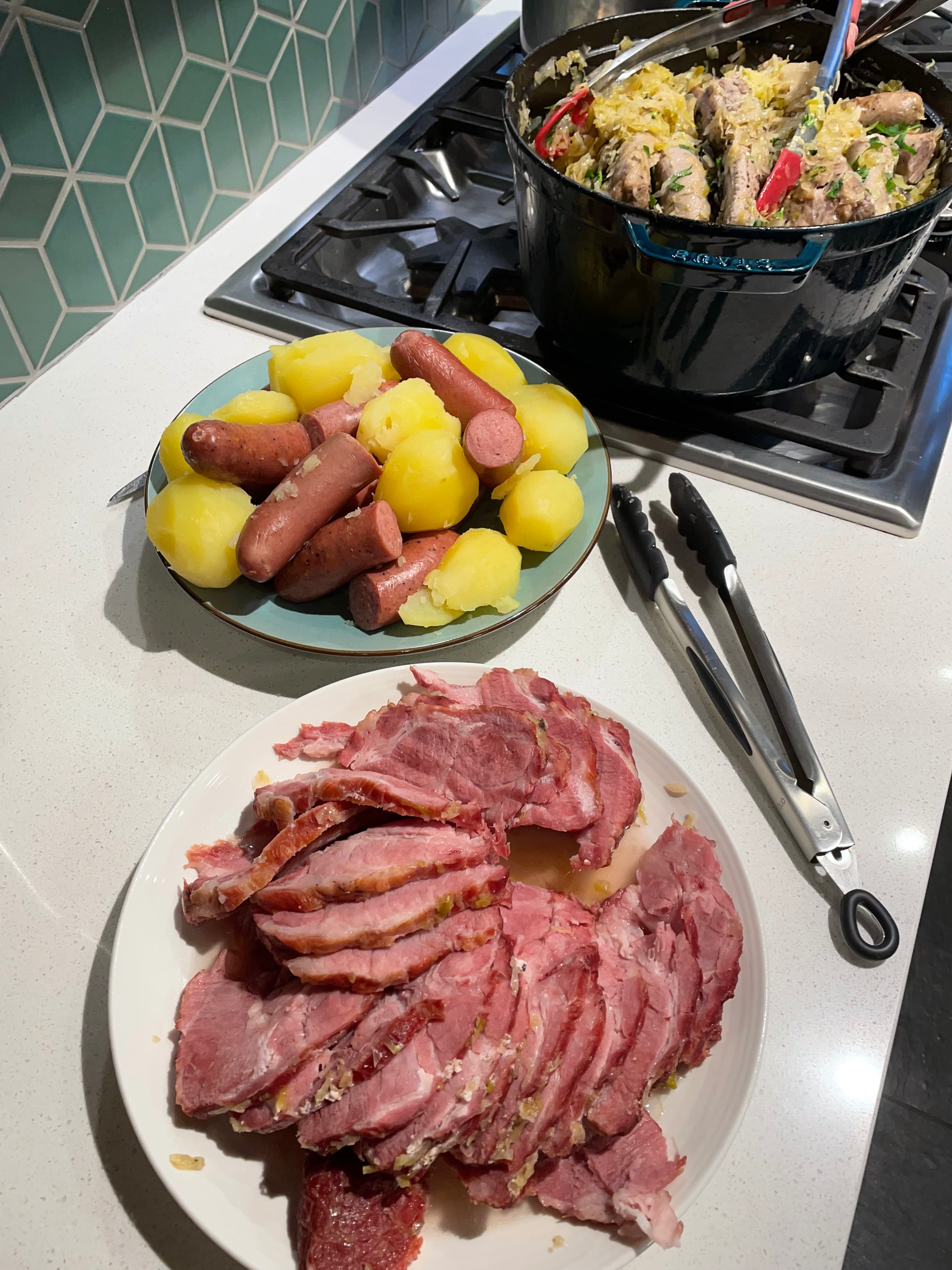 Pretzel breadsticks and obatzda to start and choucroute garnie for the main. Sweet potato flan, sachertorte and tarte normande for dessert.