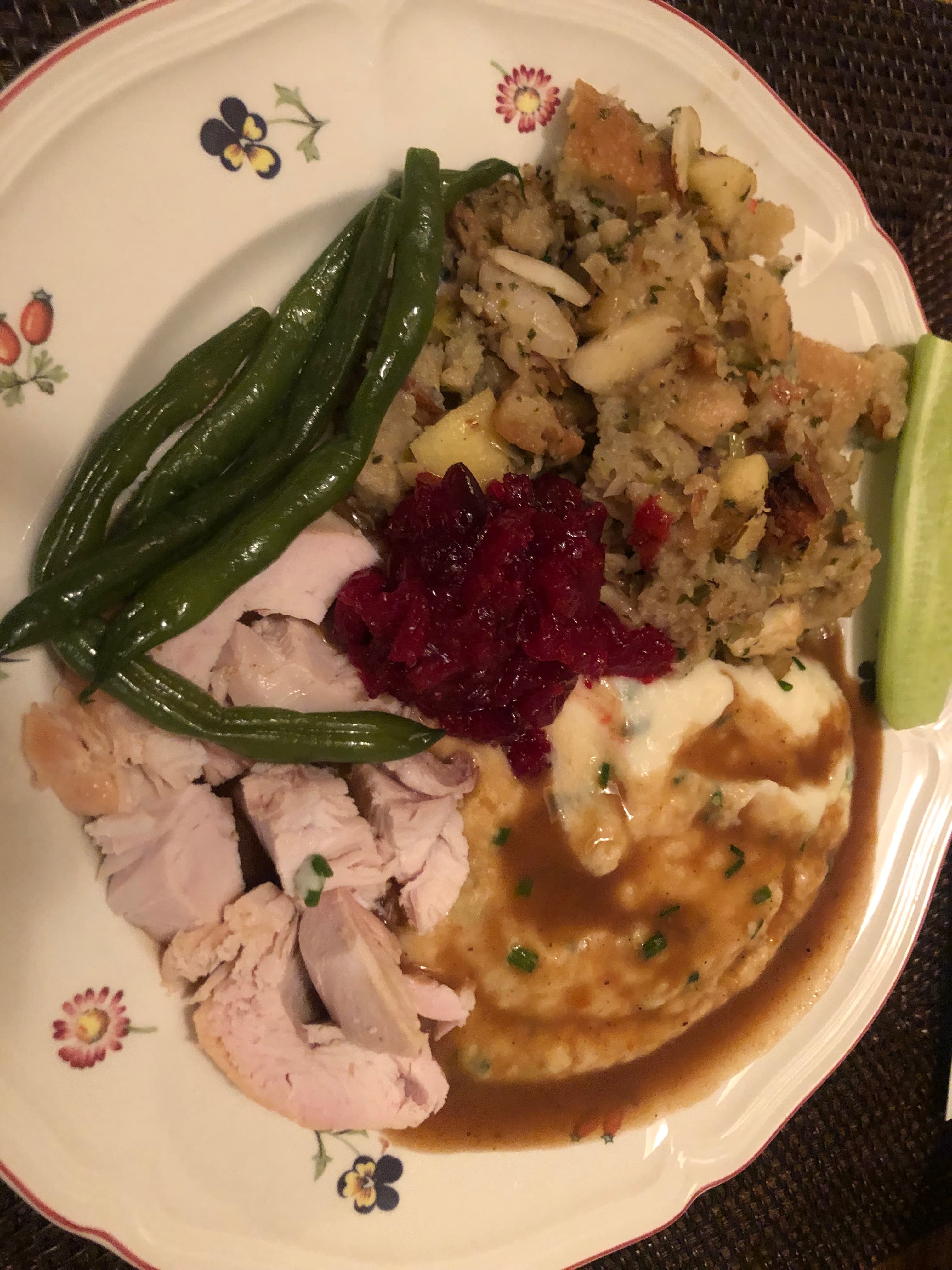 I did everything, worked from 10 am onward, just short breaks … we sat down to dinner at 7:45. Cozy, just 3, my daughter, her ex. I didn’t have to worry about whole house being spotless. I even ate some, for a change. Everything was perfect except the green beans … the market where I bought them turns out they were old and tough (they looked fine!). I boiled, shocked, drained then sauteed with garlic in butter and olive oil. Peeps liked even though I didn’t.