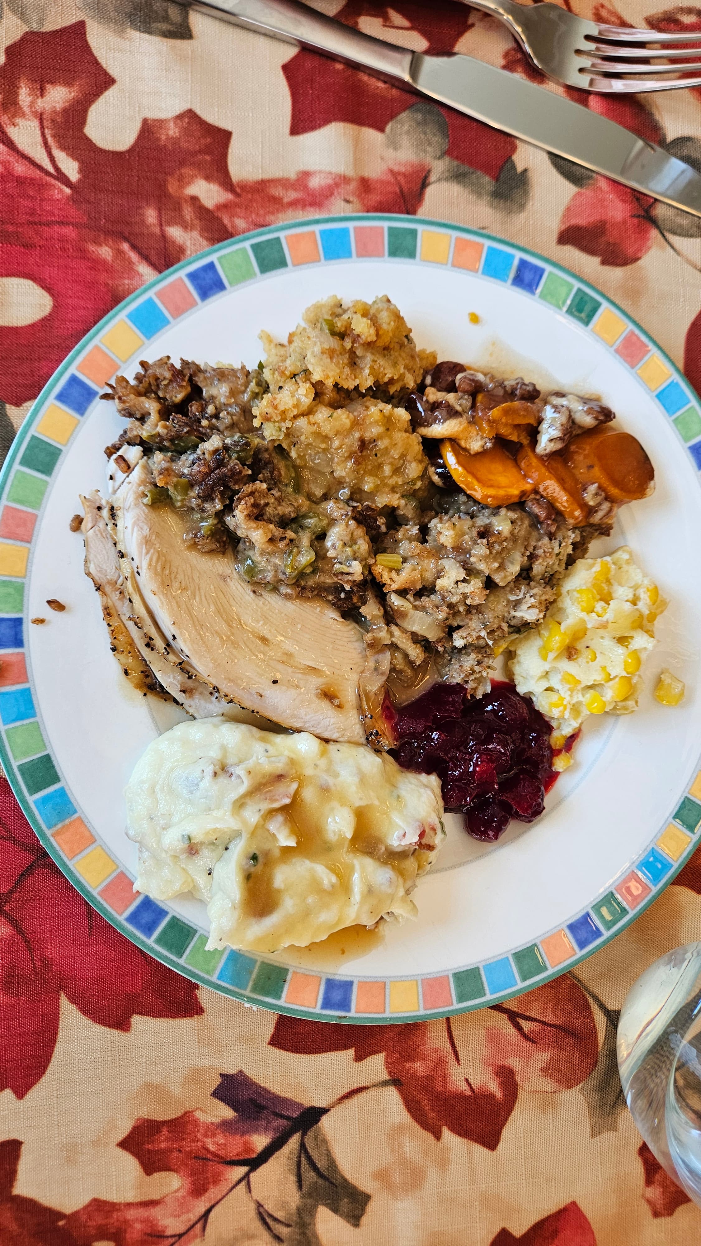 Other than our last minute change of guest list, everything went smoothly. Our 15 pound bird cooked in about 2 hours and 20 min on the convection roast setting and we were eating by 1 pm. Sides were bacon mashed potatoes, sweet potatoes with marshmallows and pecans, cornbread stuffing, farmhouse stuffing, green bean casserole, corn pudding, cranberry sauce, and gravy. We took a long rest before dessert, which was a bourbon pecan chocolate pie, a Costco pumpkin pie, an apple pie from the bakers at our favorite coffee shop, and a pumpkin cheesecake from my husband with a gingersnap crust and decorative white chocolate shavings, with ice cream for those who wanted it. I made a batched bourbon and maple syrup cocktail that was delicious and festively autumnal. We also had apple cider from a local orchard for those not imbibing. Our missing guests received a delivery of everything. All in all, it was a great meal, and hopefully next year will go just