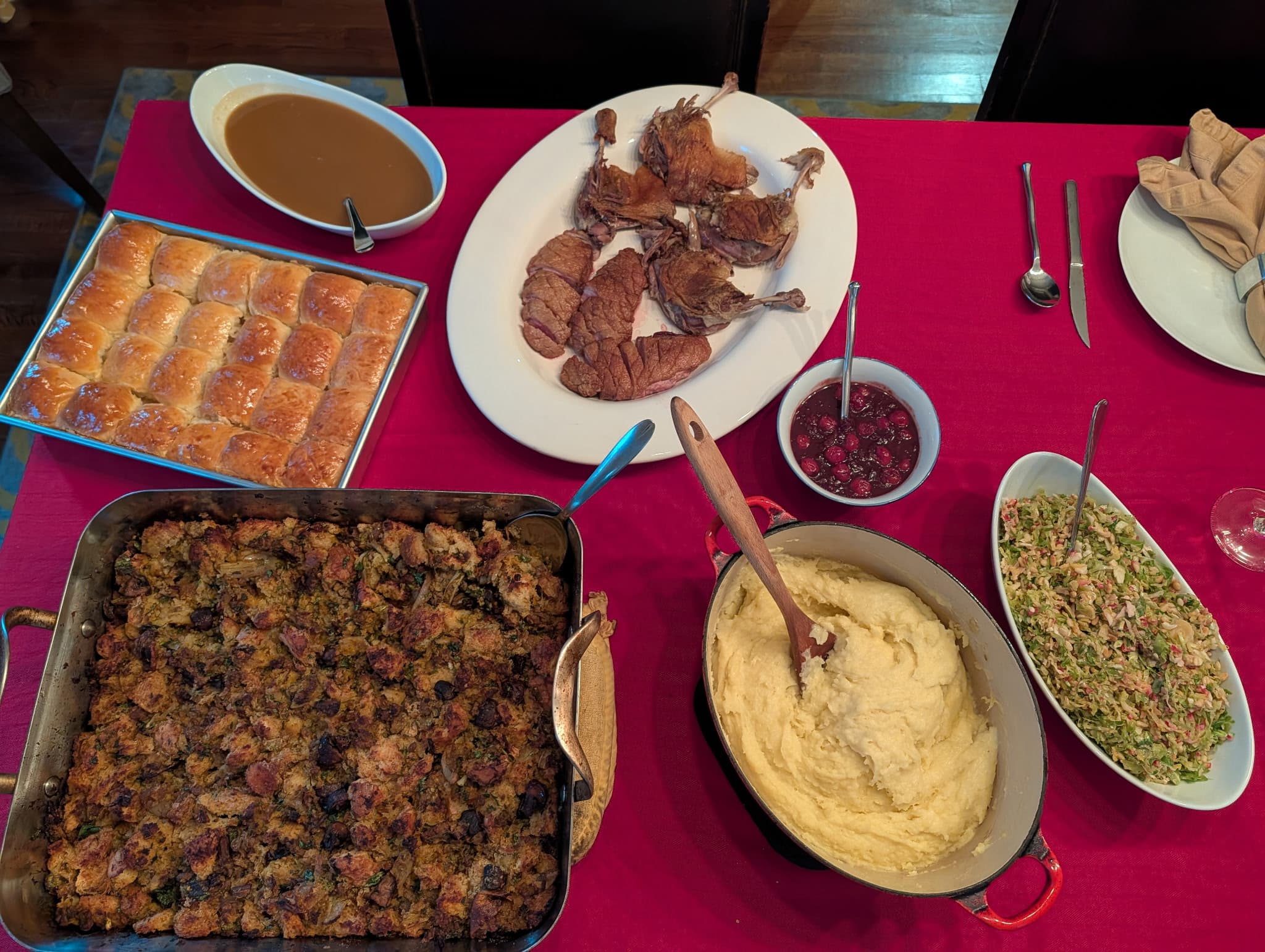 ) day of rest today following a successful feast yesterday! Everything was delicious but the duck breast (rubbed with baking powder and salt and dried in the fridge over night before searing) was the best I’ve ever made, and my stuffing was perfection this year. My spicy jalapeno crab cakes were also fantastic. I finished off my guest’s contribution of seared ahi tuna bites and Brussels sprouts salad today for lunch as I wanted something lightish after a big day of eating and drinking yesterday, but there will definitely be stuffing and pie later!