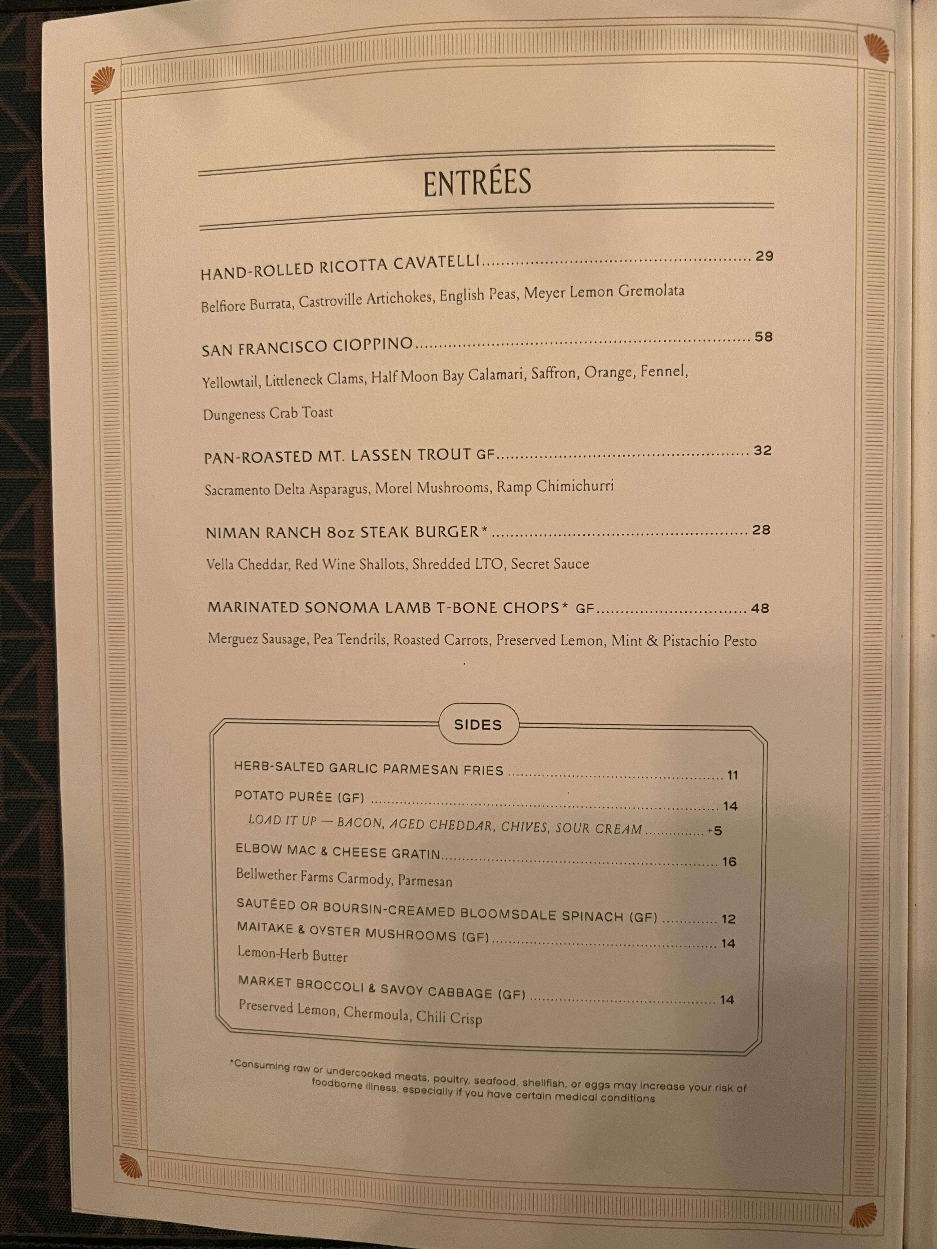 The Big Four is named after the “Big Four” railroad tycoons / robber barons of the Central Pacific Railroad. Fun fact: Nob Hill is also named after these tycoons, who were also called nabobs shortened to “Nobs” (thanks Google). The interior is dark and swanky with lots of wood and brass. I got a seat at the small bar without a reservation. The bar and the tables with glass tops around the bar are first-come first-serve.