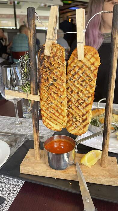 “Hang-Town” Prosciutto cheese grilled in garlic bread with marinara dipping sauce, with the requisite scissors and clothespins for disassembling. And yes, crispy tuna tacos with avocado. We also waved in the cheesecake lollipops with cotton candy. It’s fun I tell ya.