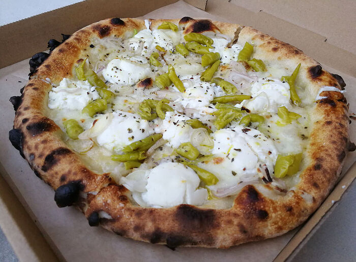 Bianco Pizza (Ricotta, Pickled Guindilla Peppers, Oregano, Garlic, Shallot, Panna):