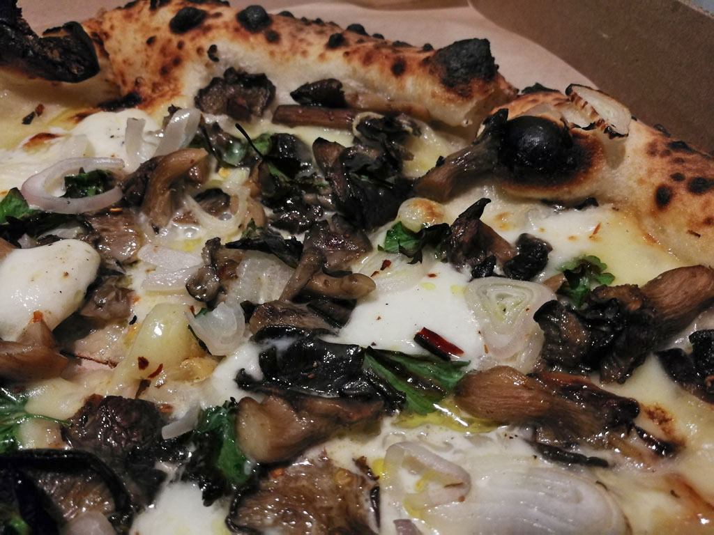 Fragrant, oven-roasted Oyster Mushrooms, bursting with controlled umami, fragrant pops of joy from the roasted Shallots, the Fontina Cheese and Panna add this lovely creamy, cheesy goodness, a tiny dash of heat from the Chilies, served piping hot on their fantastic Sourdough crust.