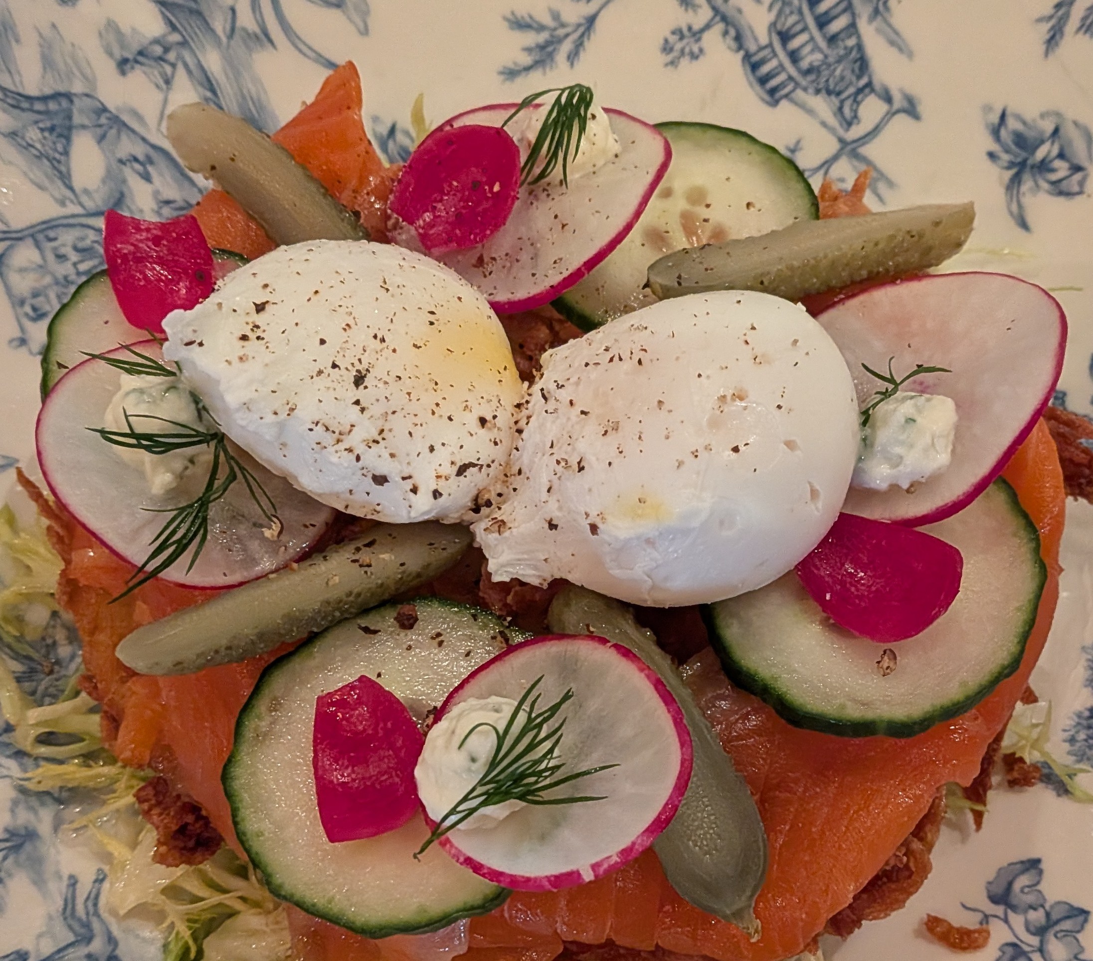 Poached Egg, Smoked Salmon, Horseradish Crème Fraîche, Radish, Cucumber, Dill, Pickled Pearl Onion