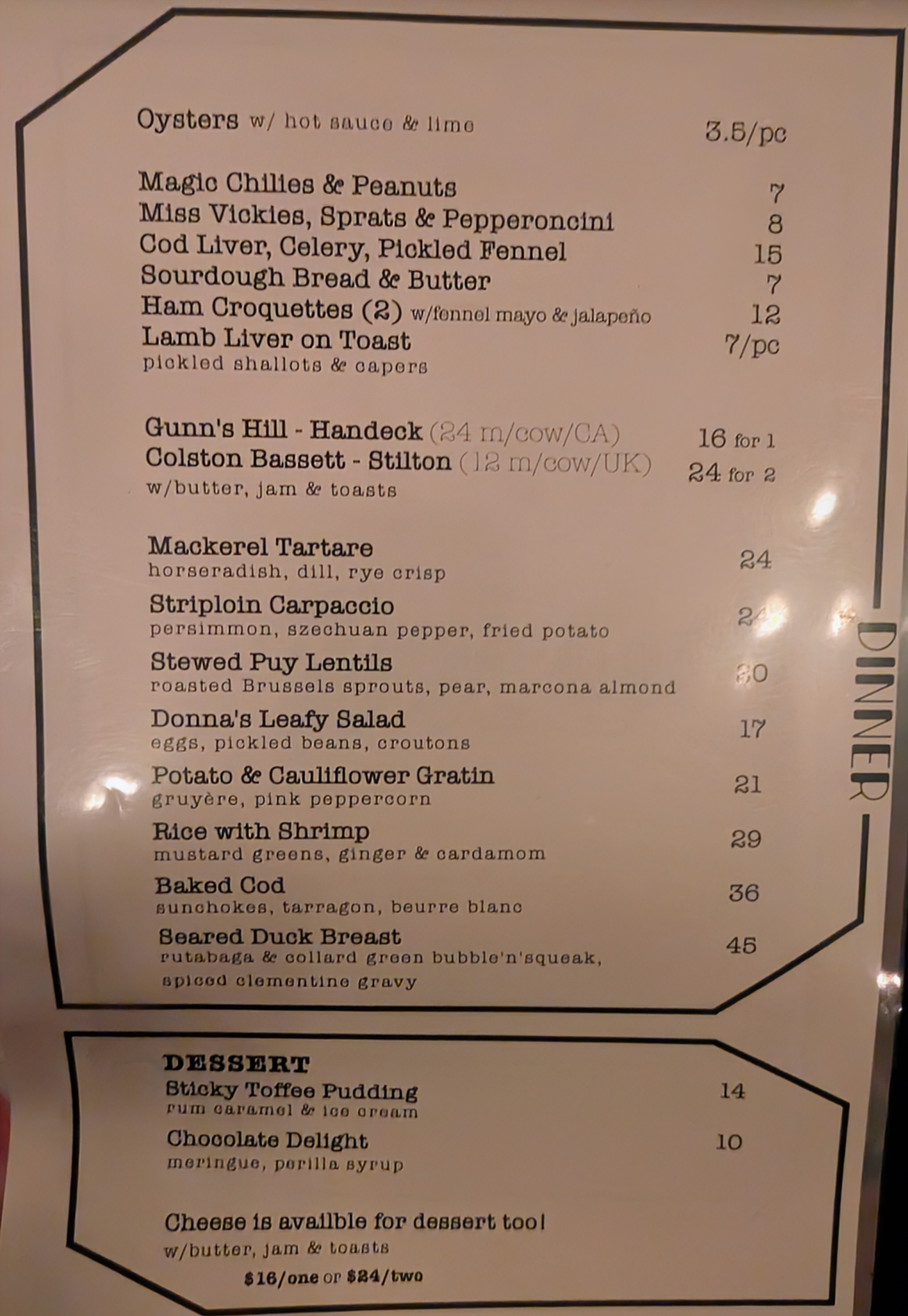 I’m kind of confused by this menu’s lack of headers. Are these supposed to be mostly shareable things? How big are they and how many should be ordered? The more expensive plates toward the bottom seem to be entrees, but maybe they’re also shareable? A bit more info on the menu would be ideal… (And unfortunately I’ve seen this a lot recently; why not just print the info so I don’t need to listen to an explanation of how to order from the server?)