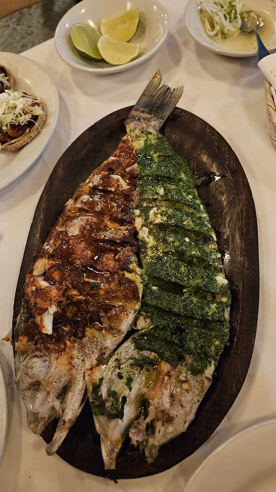 My friend insisted we get the whole fish - half red spice, half green spice. It was served with tortillas and “Mexican Caviar,” as the server called the refried beans. It was tasty, but just too much seasoning.