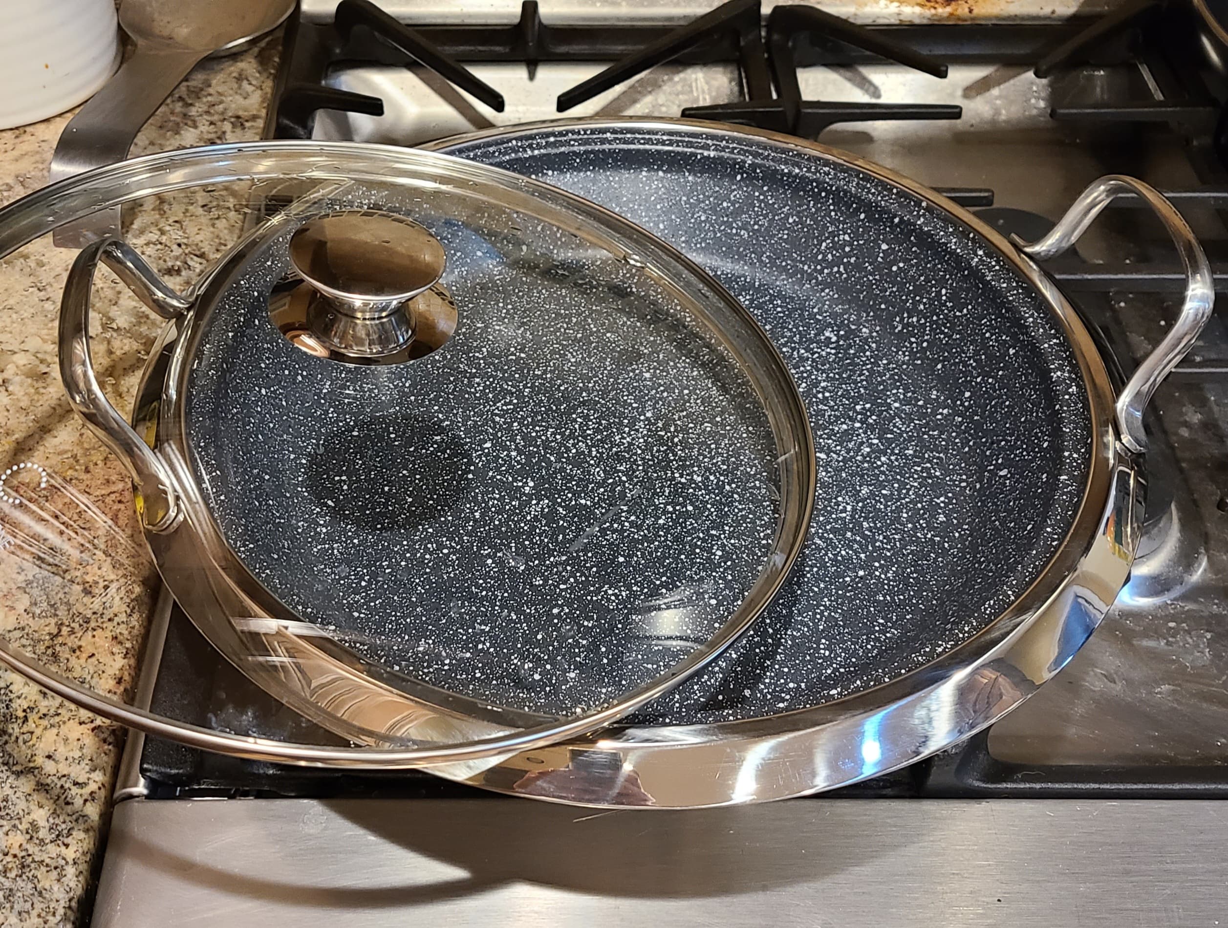 This is a “Curtis Stone Durapan [ceramic coated] 12-inch Stainless Steel”. Got it today at the Humane Society thrift for $6.40, and it still had the sticky tag along the inside of the pan, obviously never used (especially when I washed it, I dumped out the rinse water and not one visible bead of water remained, always a good sign).