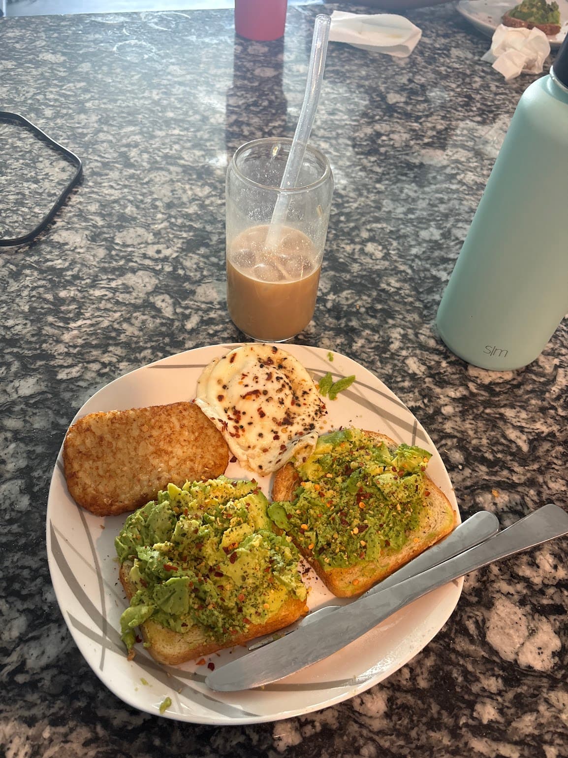 Big fan of avocado toast here. I love to toast some sourdough, smash up half an avocado on each slice, season with salt, oregano, Italian seasoning, and chili flakes. Topping it with a fried or poached egg makes it perfection!