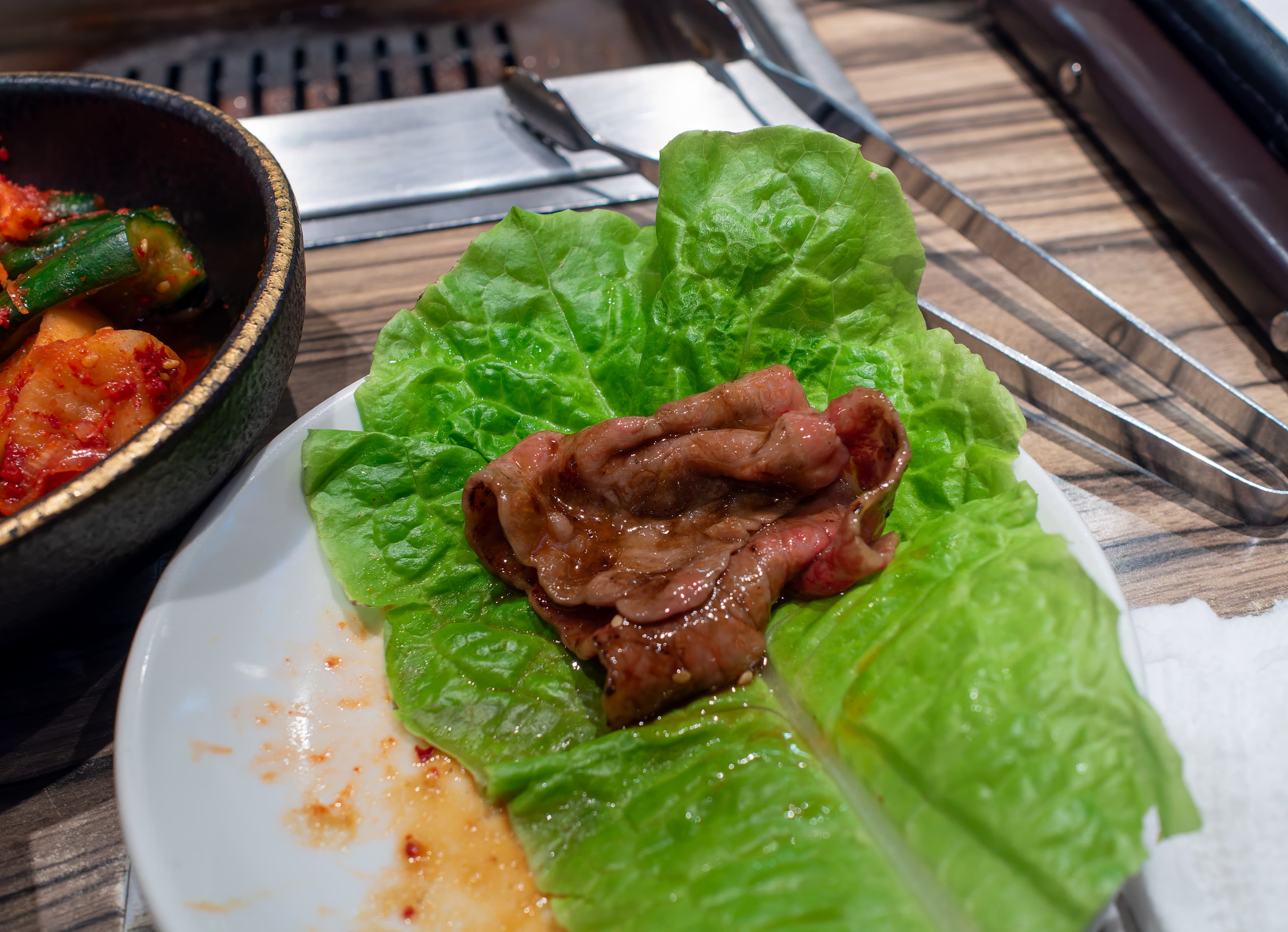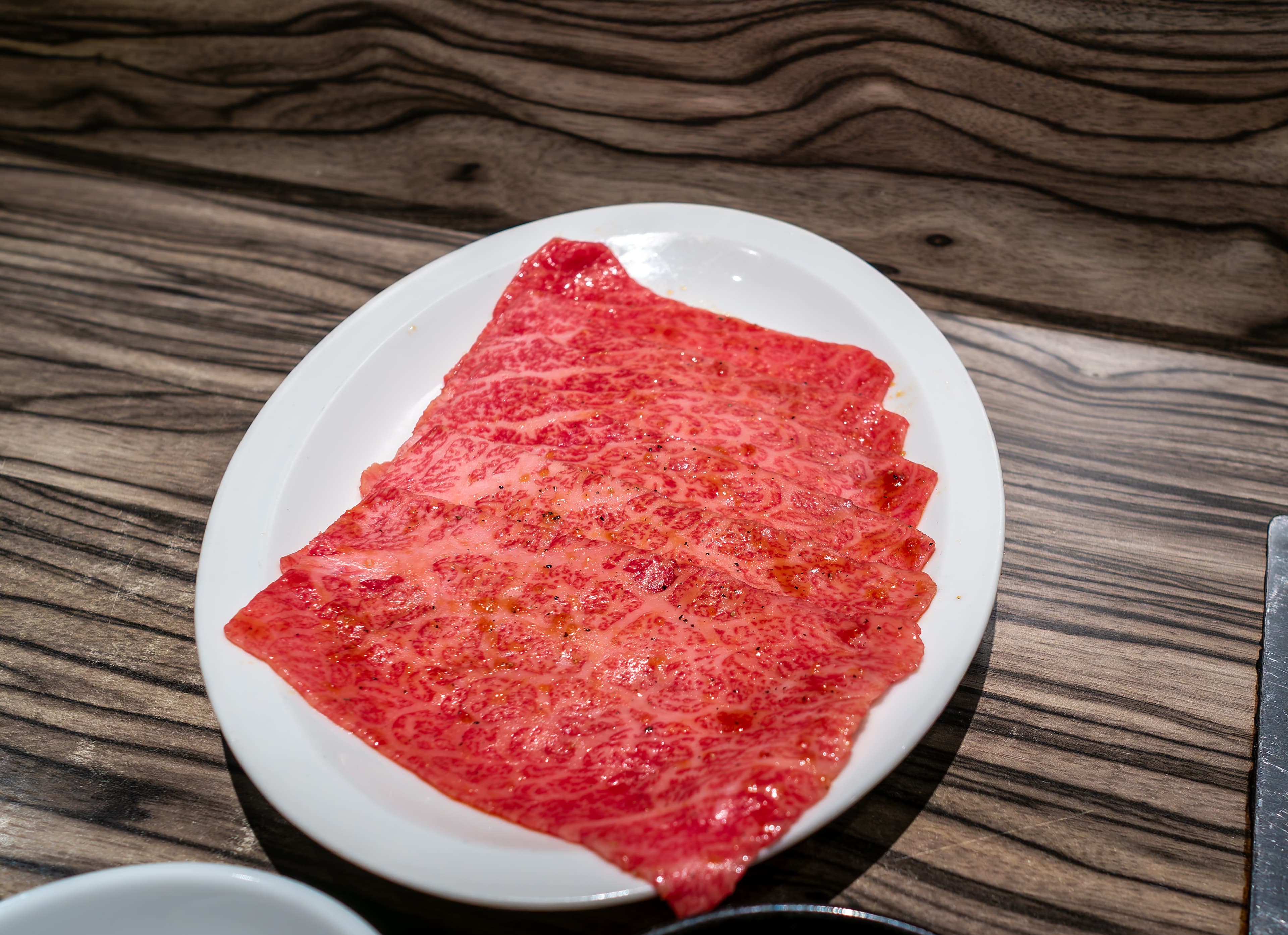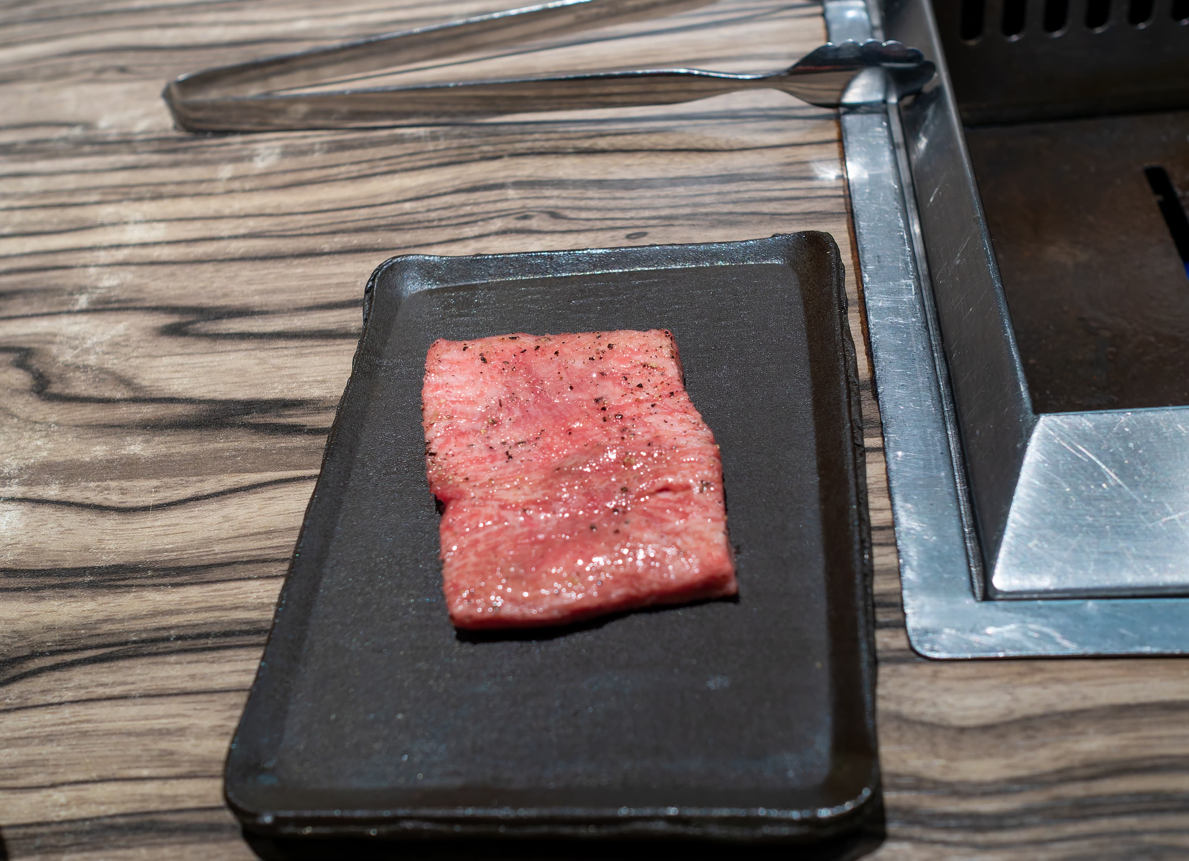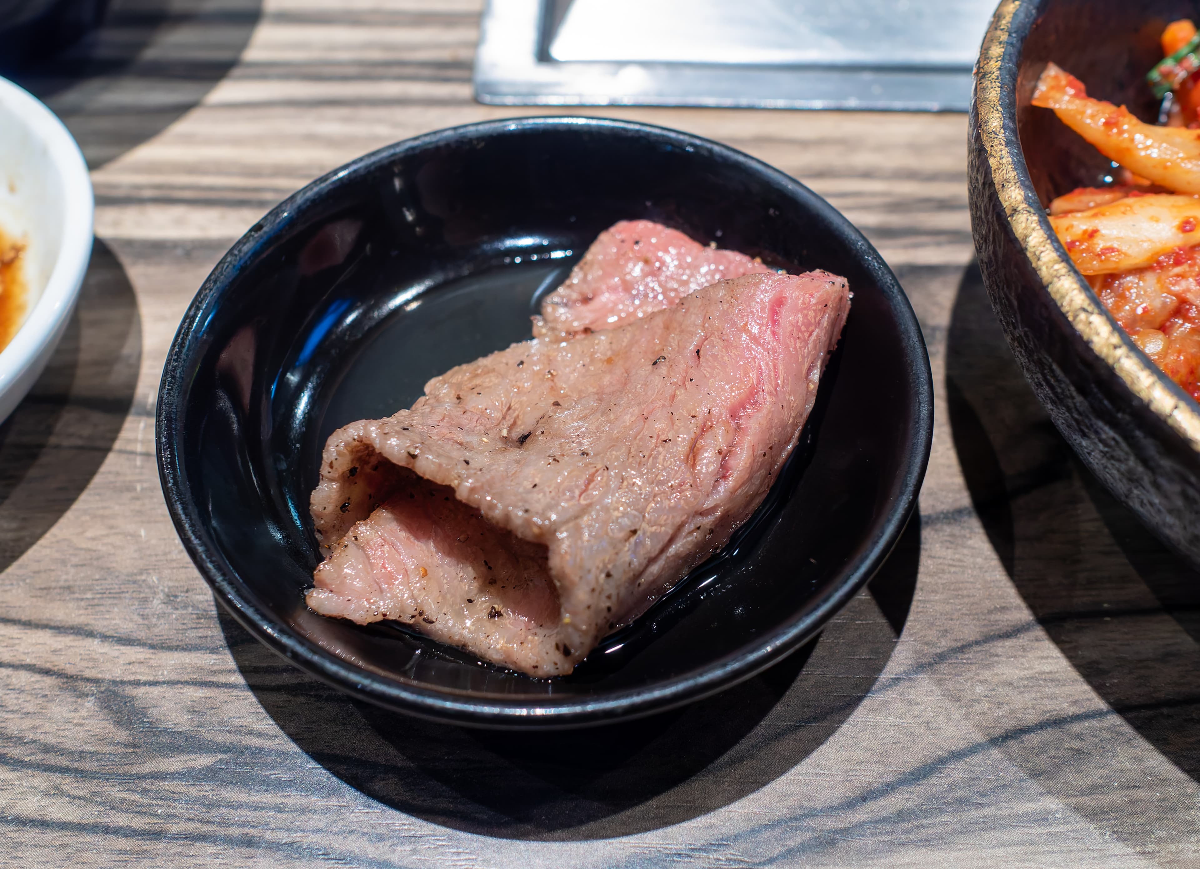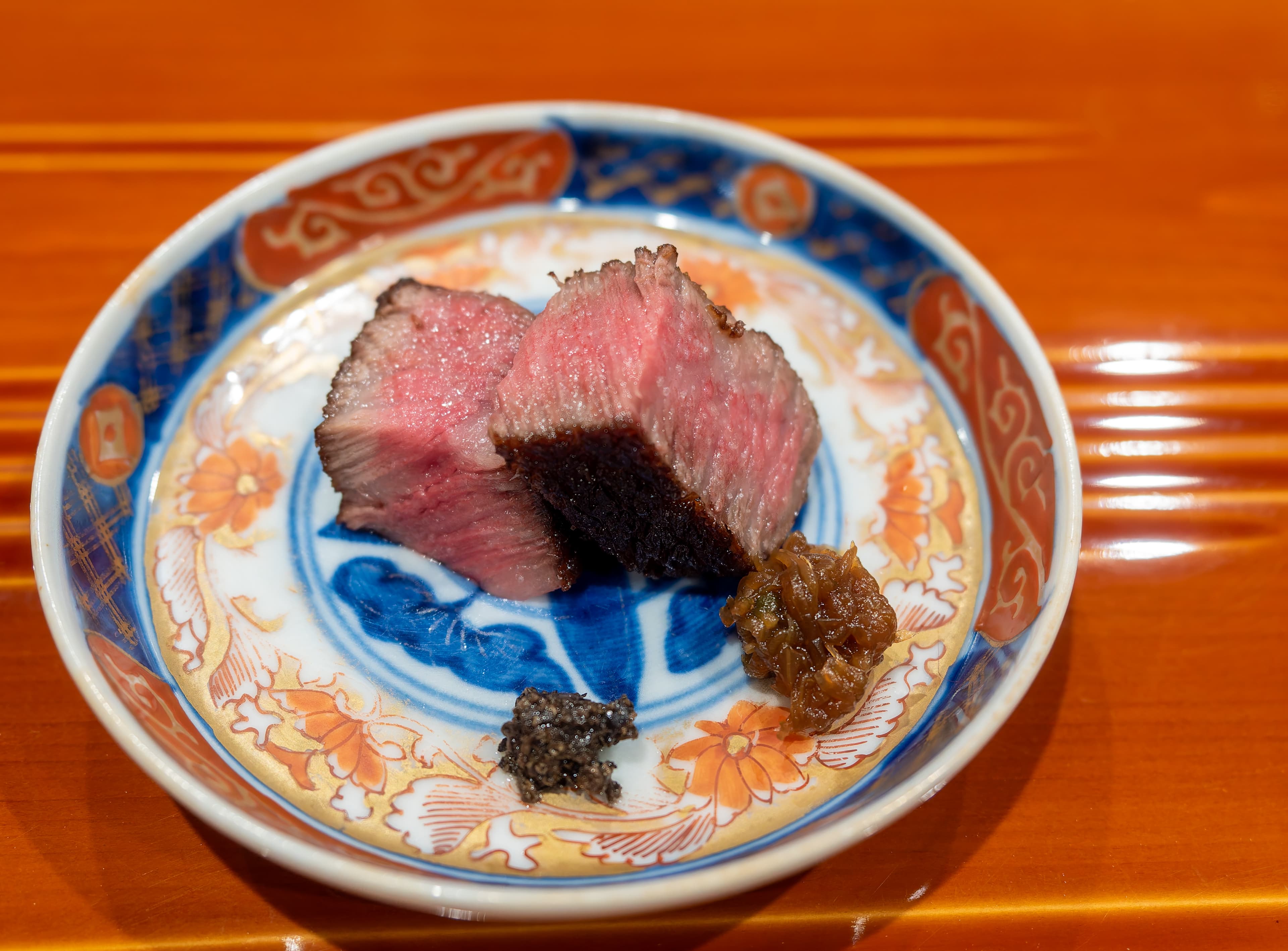 Next, the previously displayed steak, now sliced up into cubes. It was very good medium rare beef with two condiments. The one on the right I think was caramelized onions, and I forget what the one on the left was.