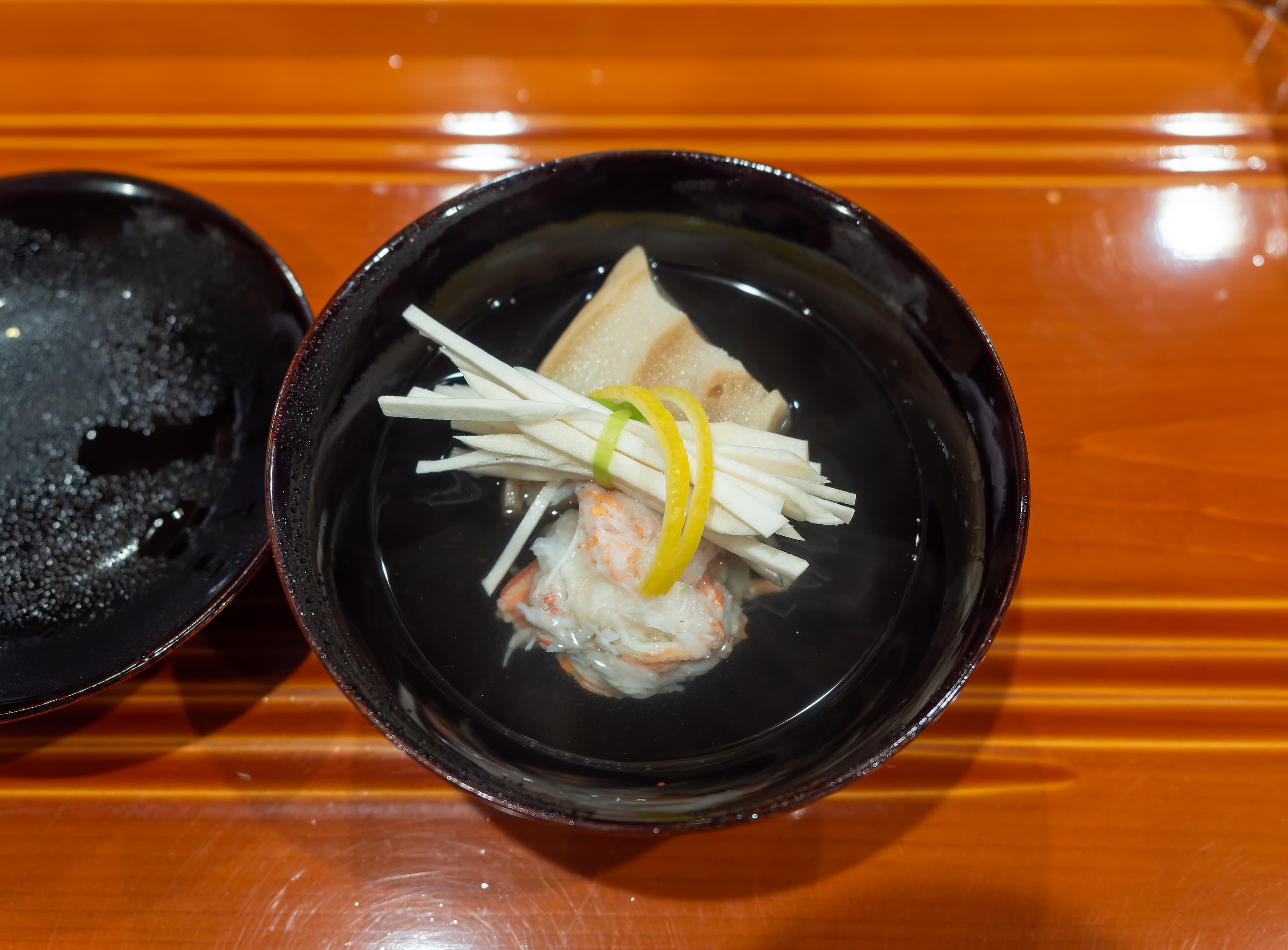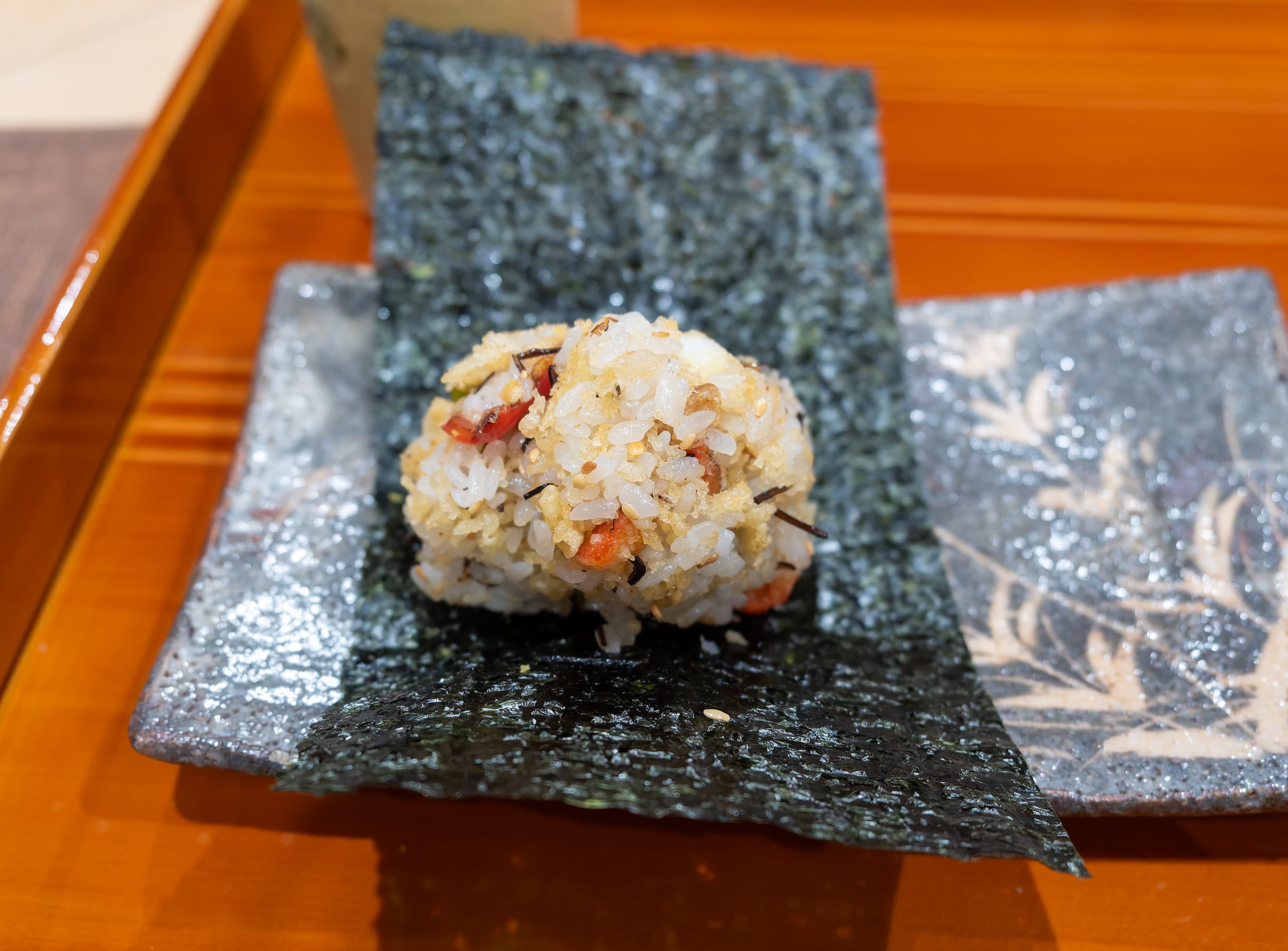 And then another rice dish, which was an onigiri / rice ball. This may have been the best onigiri that I’ve ever had. The rice was again perfect. There were some pickles, freshly grated yuzu zest, and I think some more of the red pepper featured earlier within.