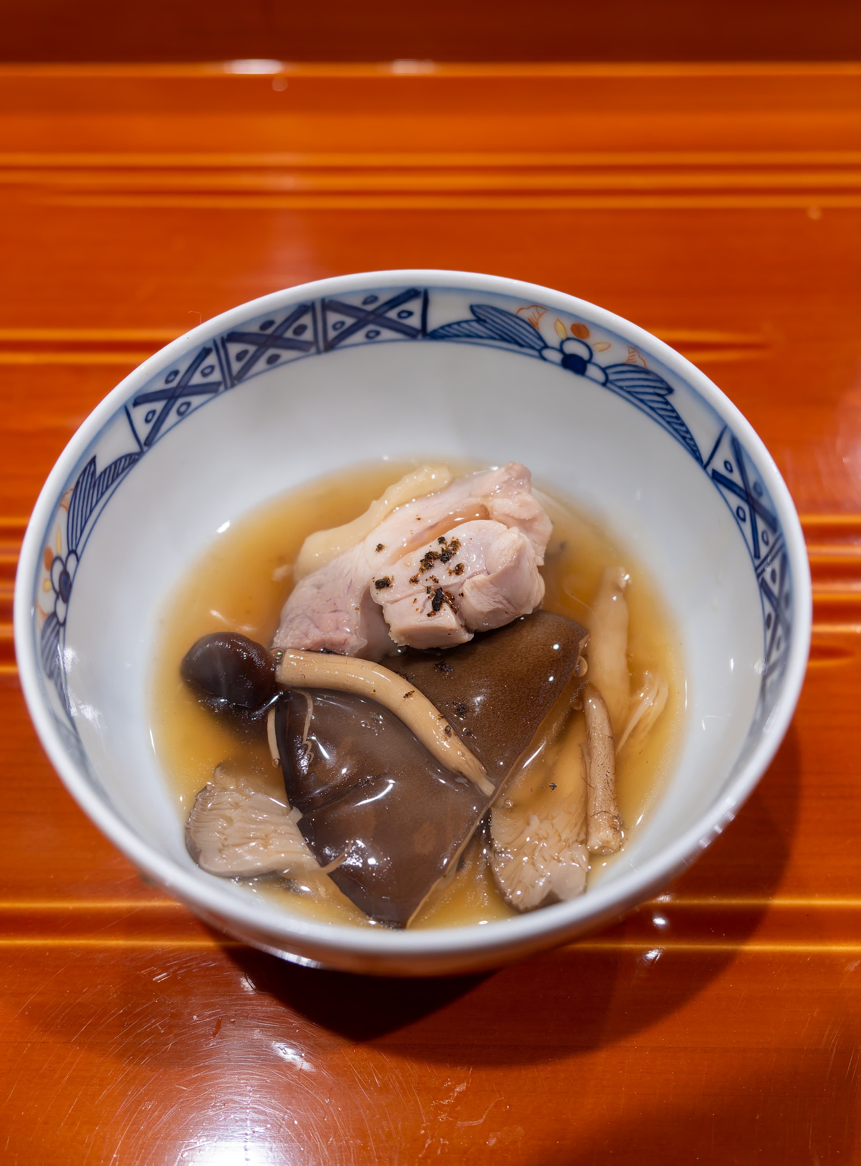 Next, the owan / soup course. This had a large shrimp ball, matsutake mushroom, and a root vegetable, all in a clear dashi.