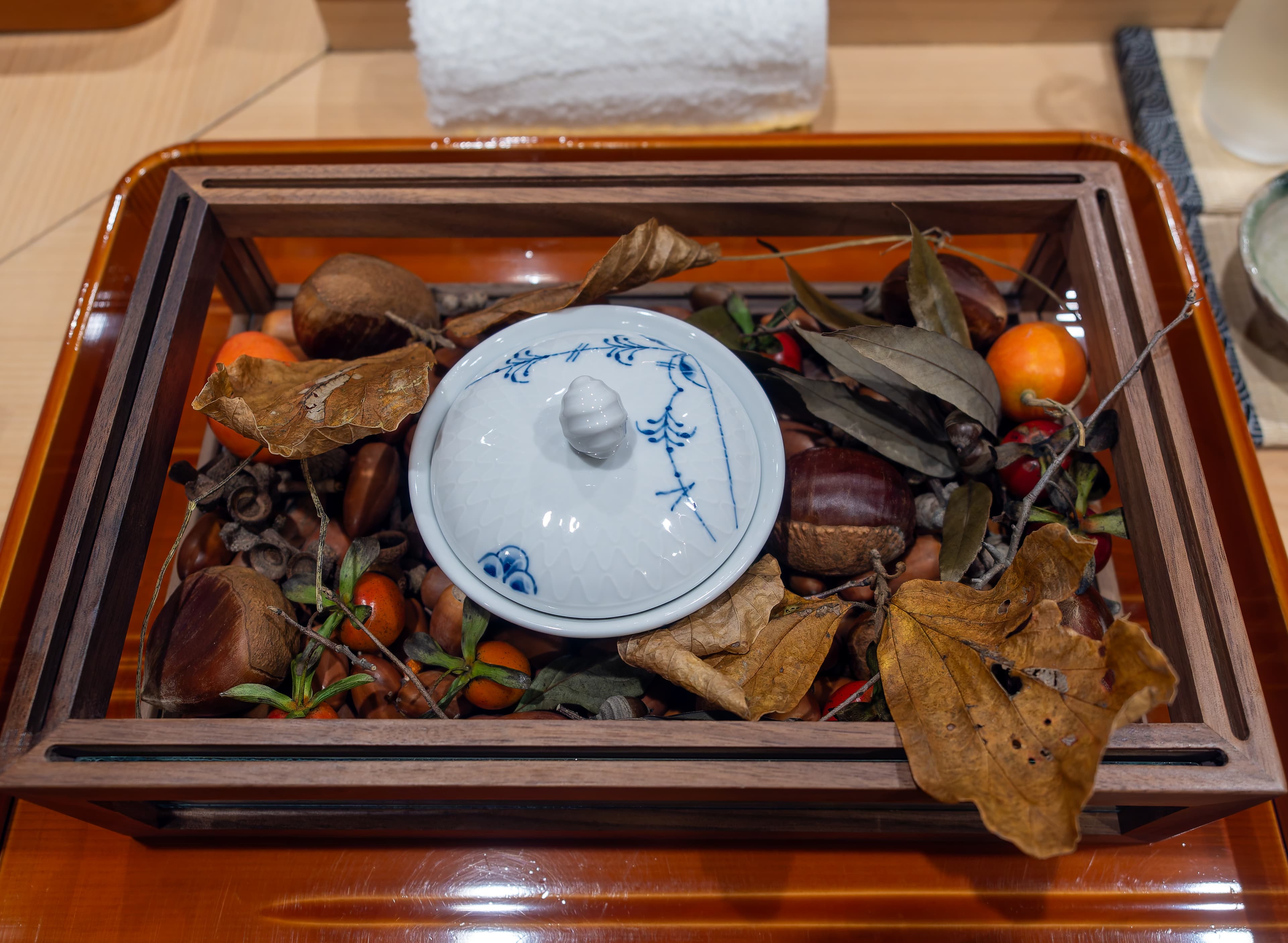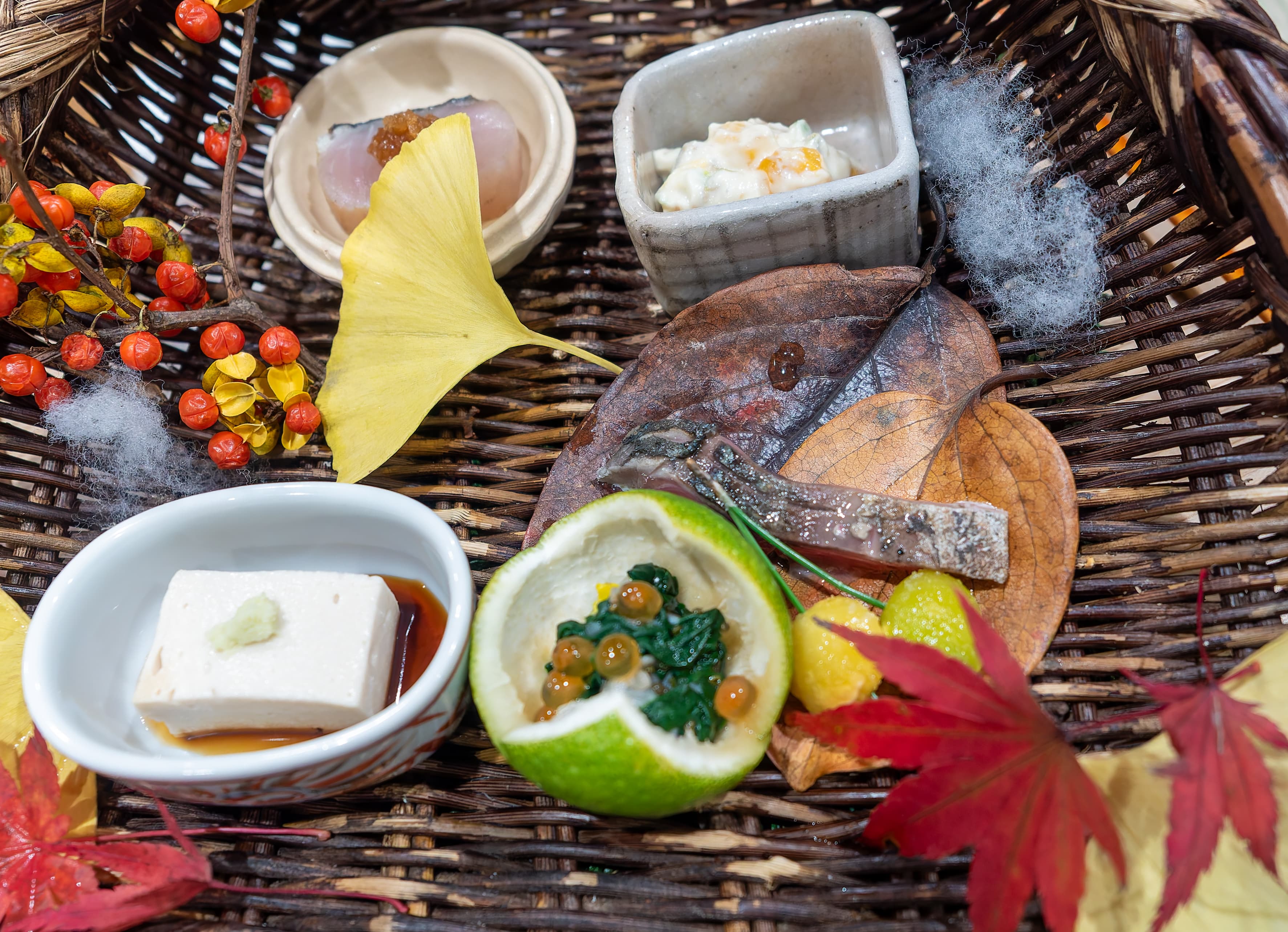 Next was the hassun course - small dishes or appetizers with a seasonal theme. It was such a beautiful autumn themed presentation. There was a fruit salad with sweet tofu, saba / cured mackerel, spinach with ikura inside a hollowed out sudachi, tofu on soy sauce with a dab of ginger, and Spanish mackerel.