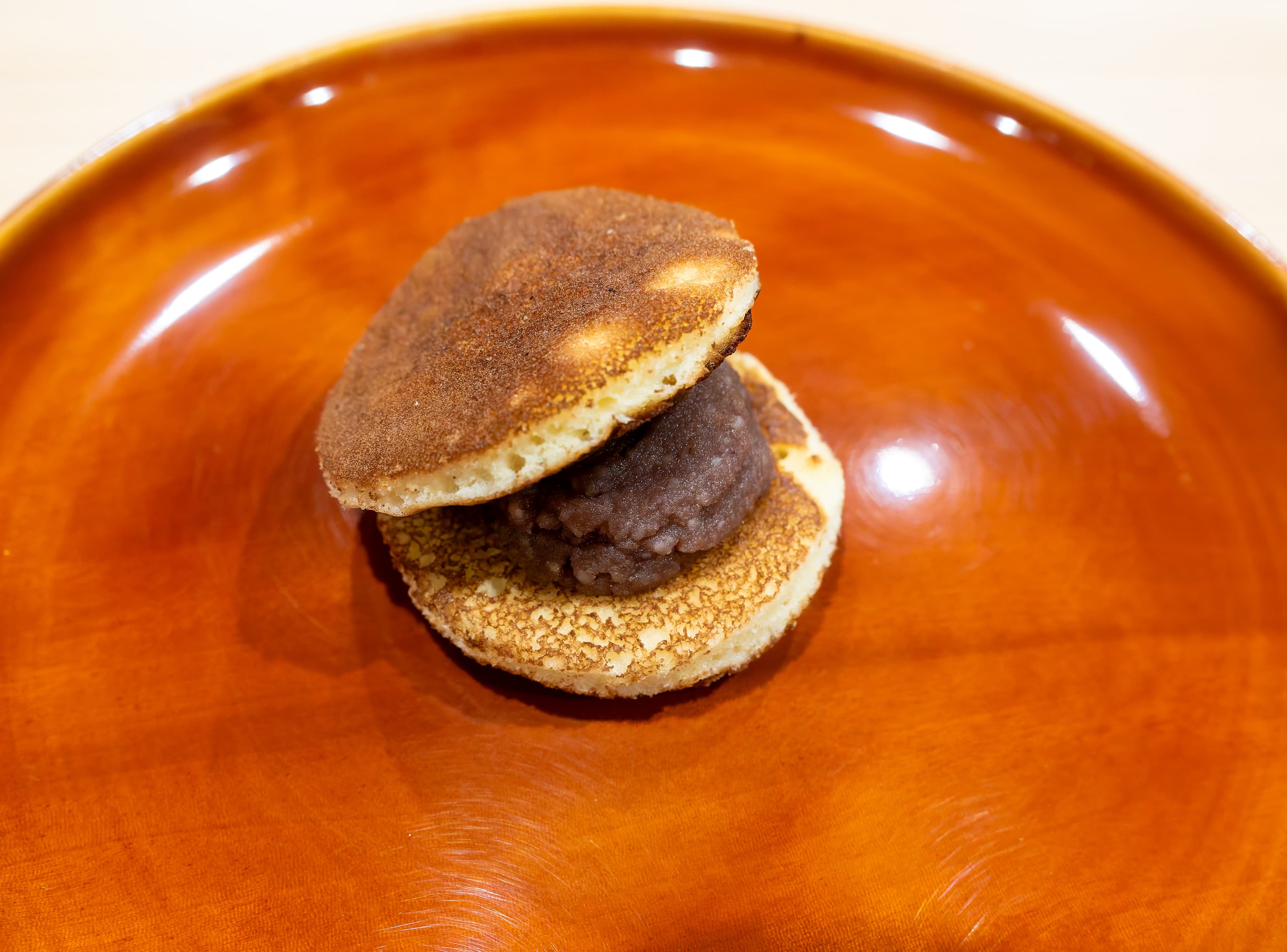 Finally, dessert. This was a very nice dorayaki, which is a pancake filled with adzuki / red bean paste.