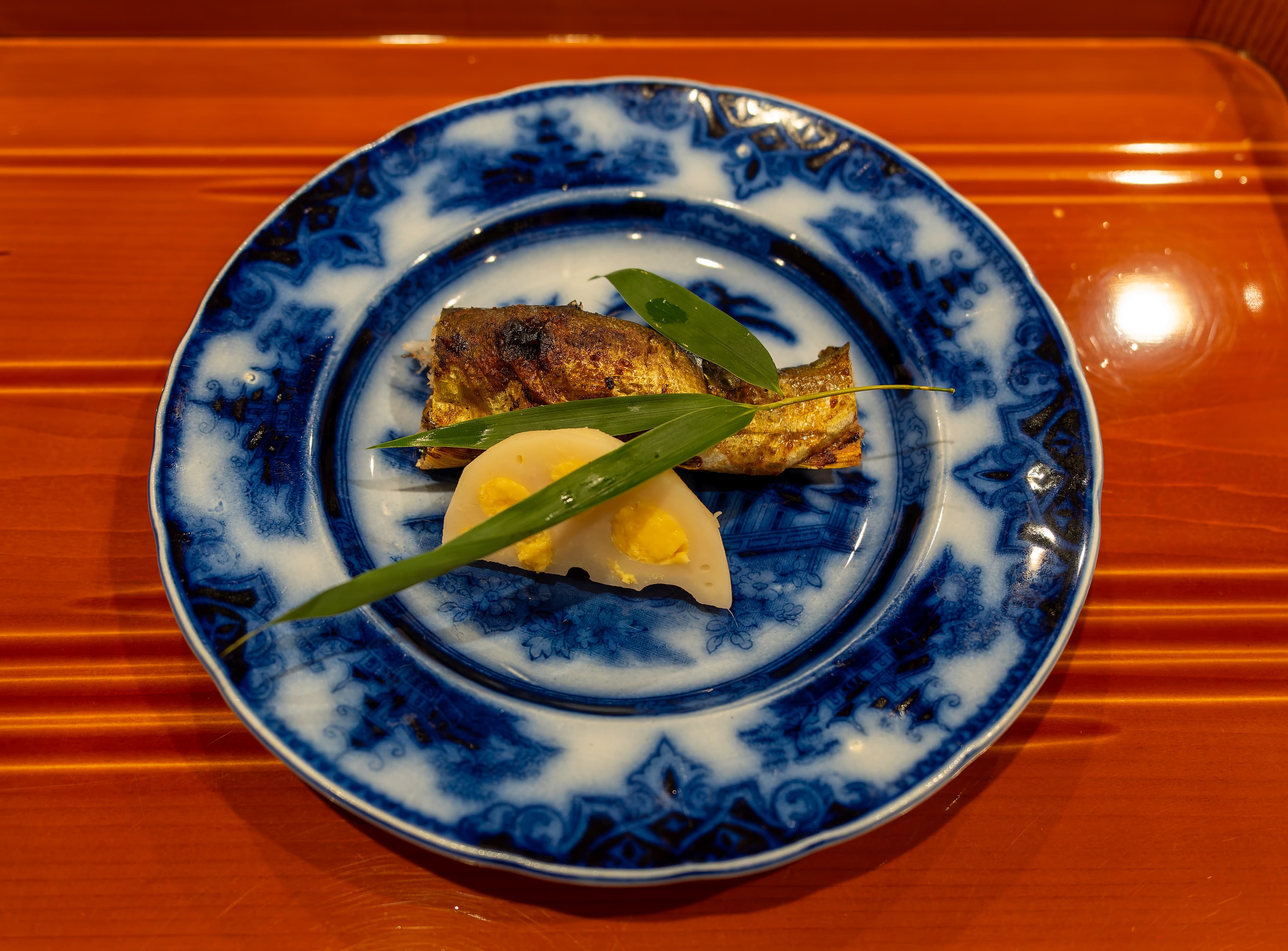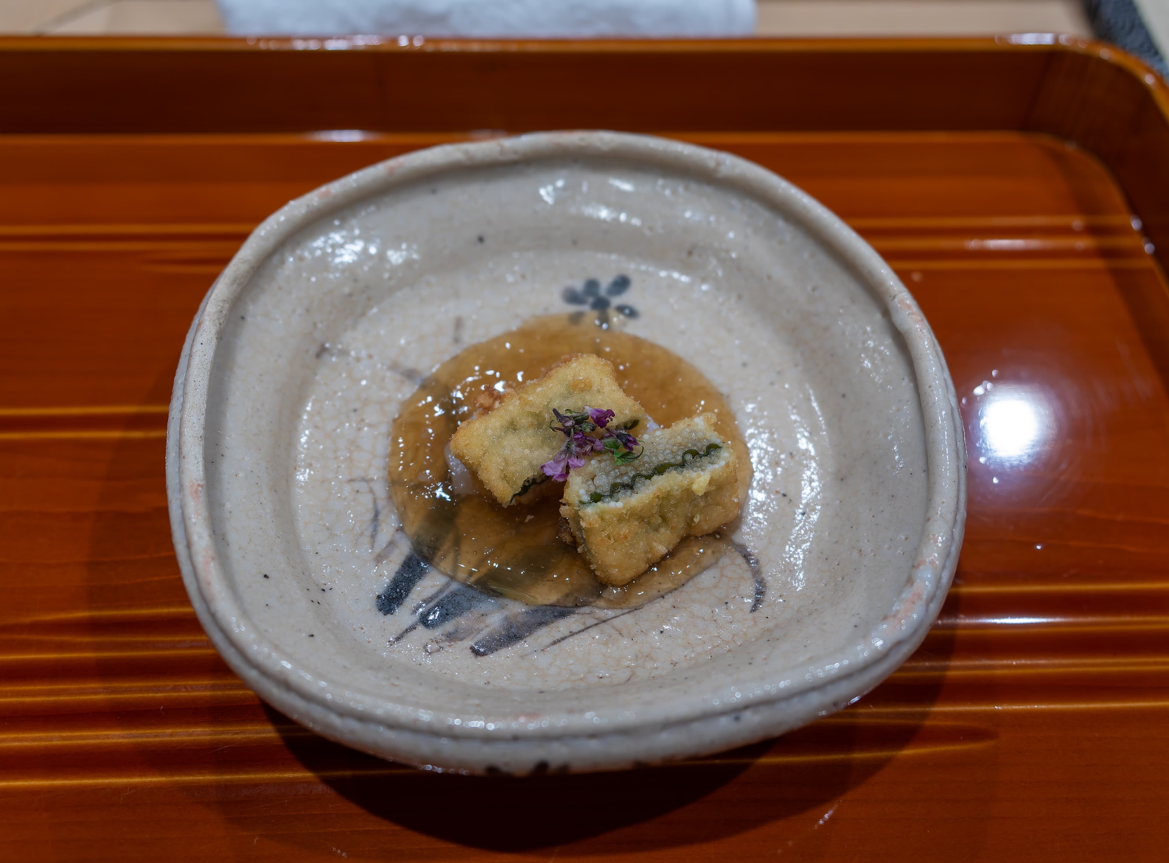 This was a yakimono / grilled dish I believe. It was ayu / sweetfish. It had a slightly smoky flavor from the grill, and had lots of sweet roe within. Delicious! There was a lotus root stuffed with egg on the side.