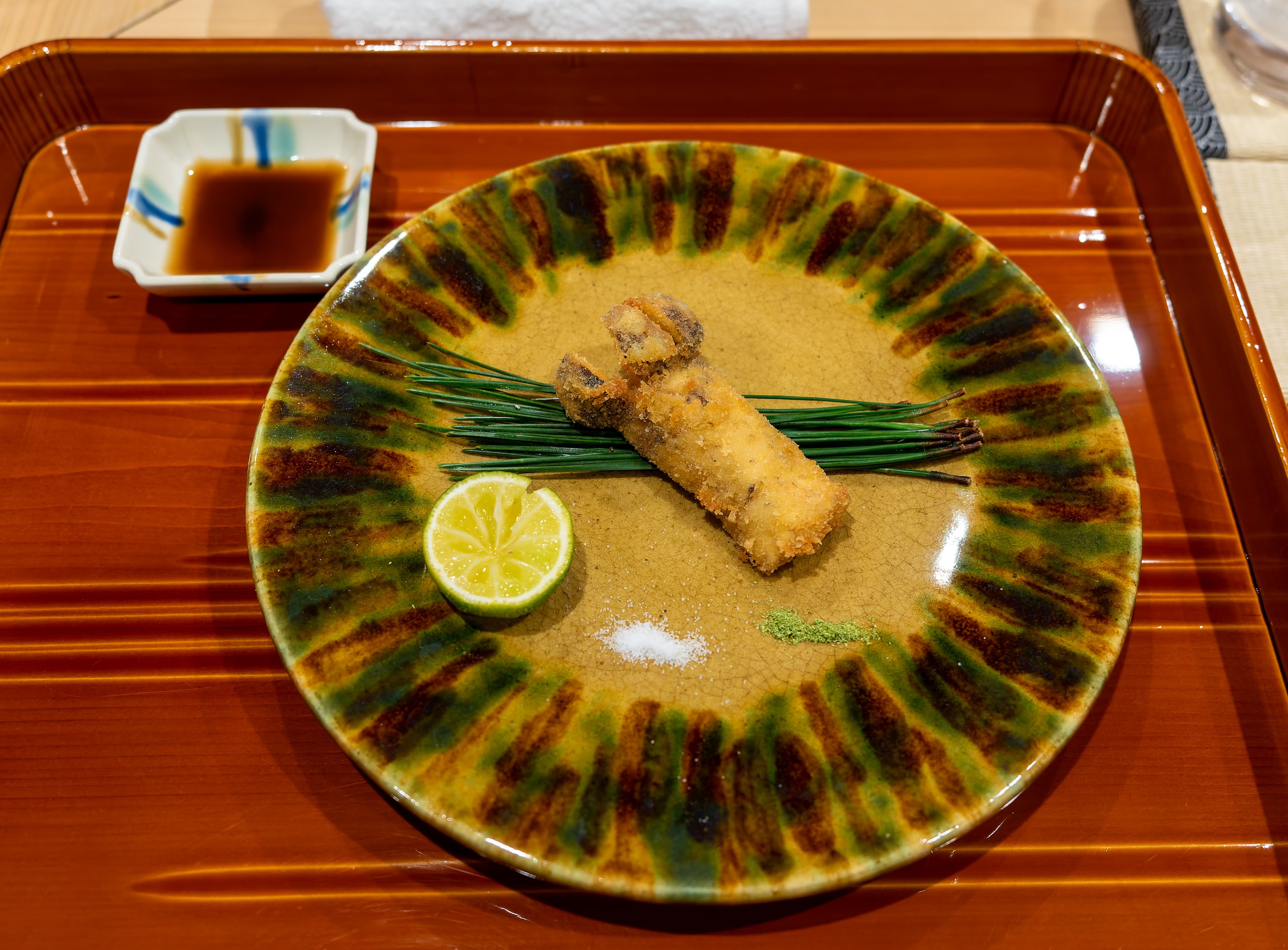 The next course was one of the supplements - the matsutake mushroom. This was prepared as tempura, with matcha flavored salt, plain salt, tentsuyu, and a sudachi as condiments. Also delicious! It was meaty and perfectly fried.
