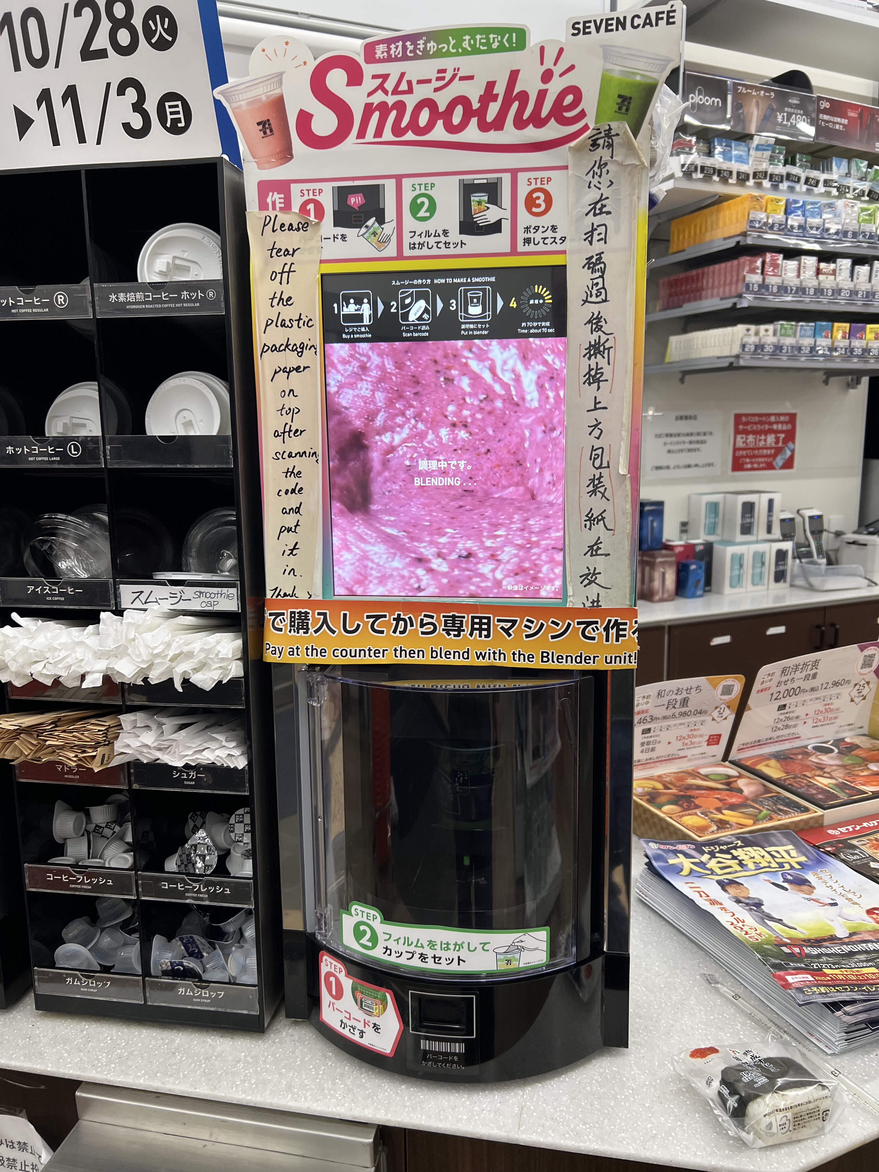 A matcha smoothie and an ikura onigiri from 7-Eleven. There are smoothie cups in the fridge section and a machine where you can place the cup and it will whip it up for you.