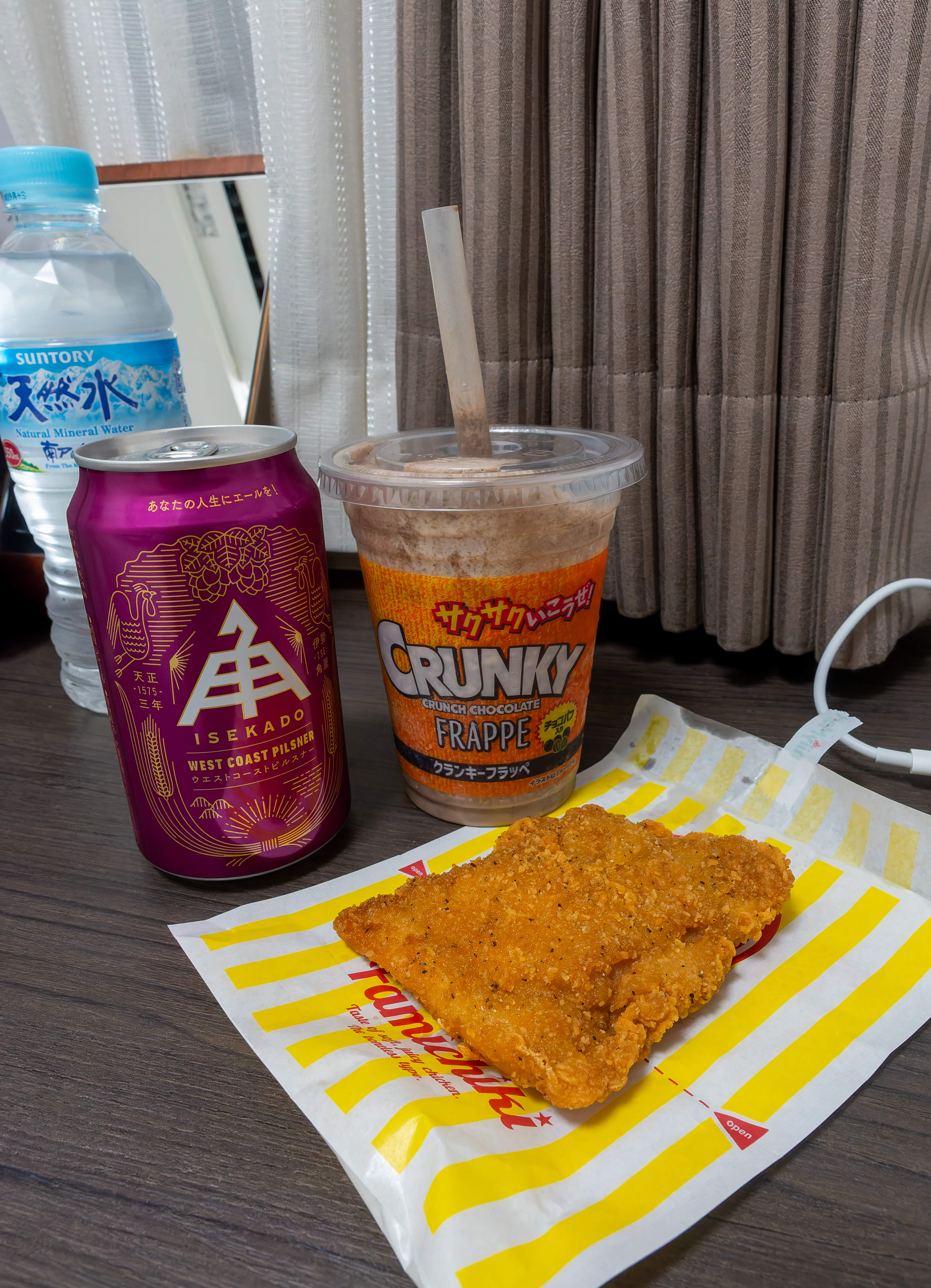 Famichiki from FamilyMart with a beer and a Crunky frappe.