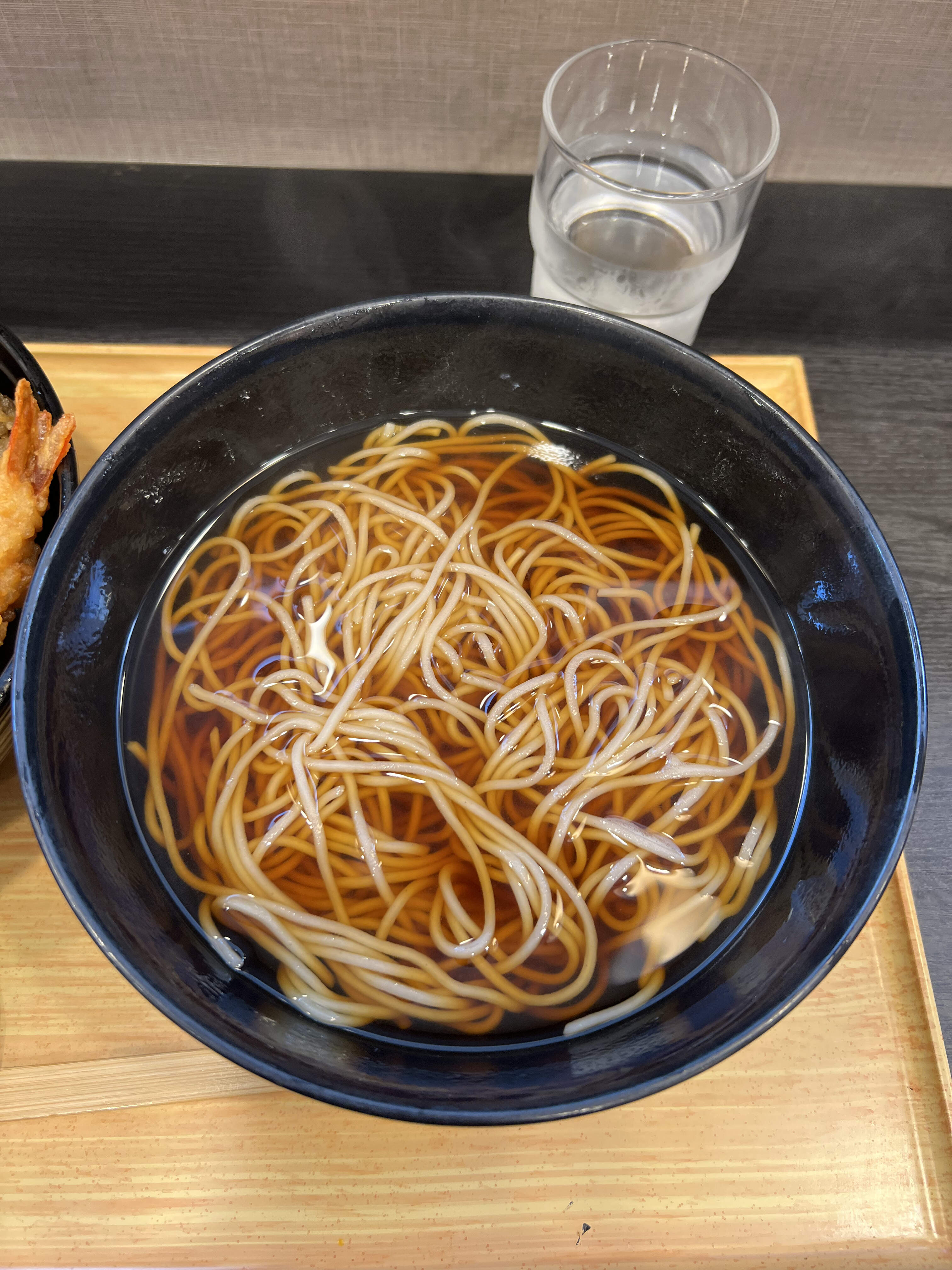 The ticket machine didn’t have an English option but it did have some pictures. I had some help from the friendly gentleman host and ordered the soba in hot broth with a side of ten-don (¥810).