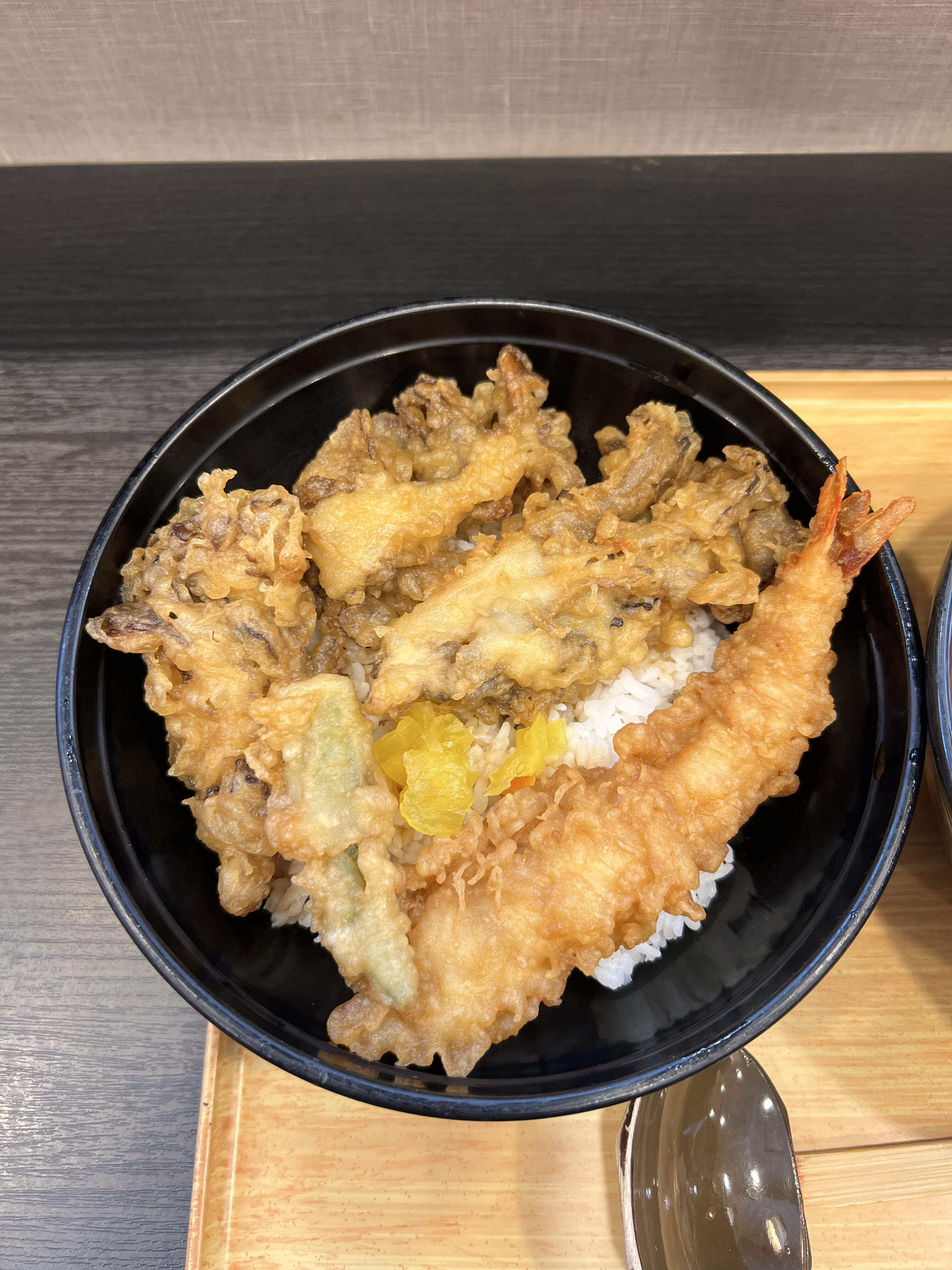 My lunch. The soba noodles were very good, simple prep in a savory soy based broth. I added some of the scallions to my bowl. The ten-don was also very good. There were tempura maitake / hen of the woods mushrooms, pickles, and a large shrimp tempura on top of rice, all seasoned with tempura sauce. All this for about $5!