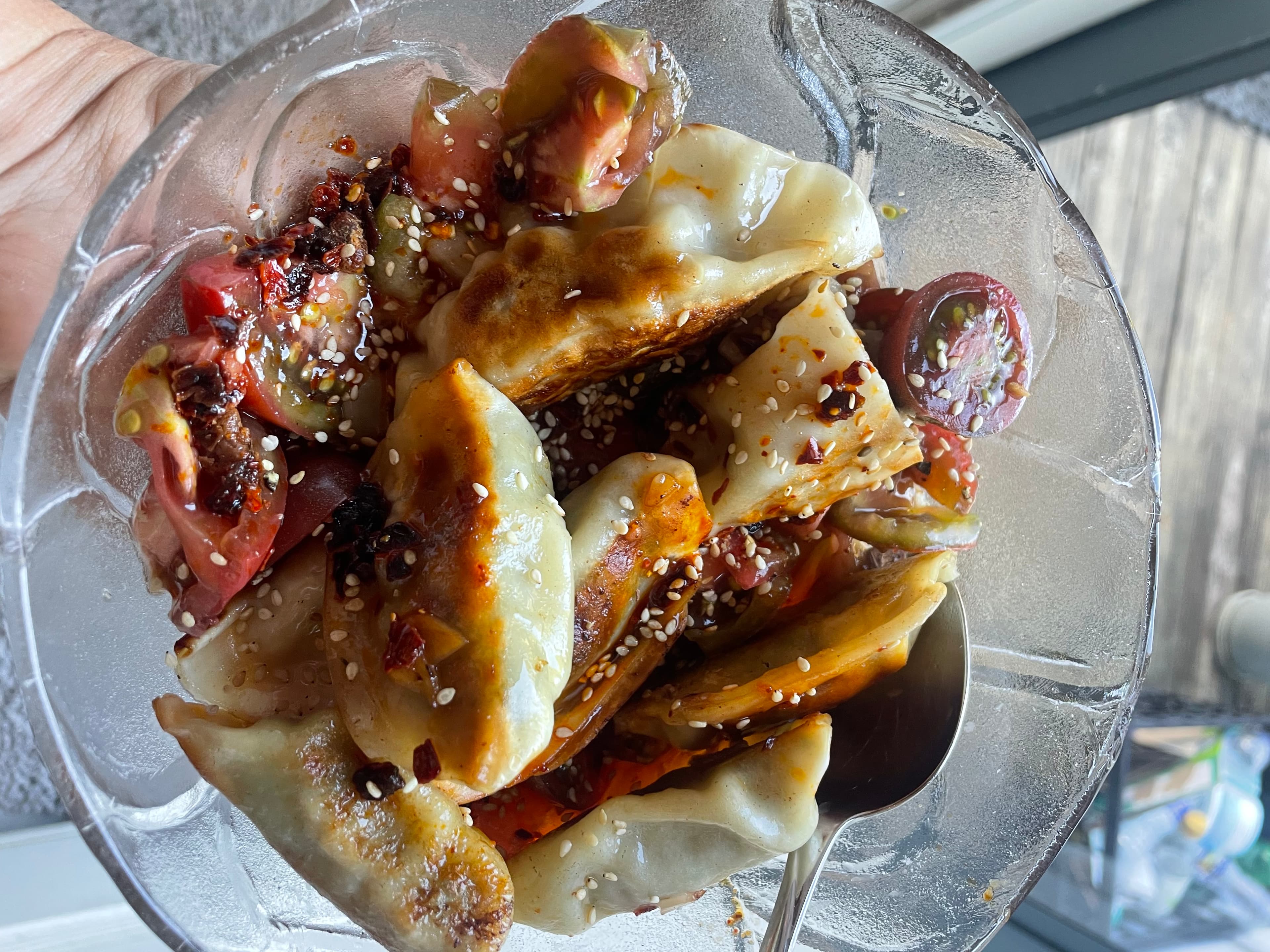 Trying to make a dent in my garden tomatoes and get the last of the dumplings out of the freezer. Success.