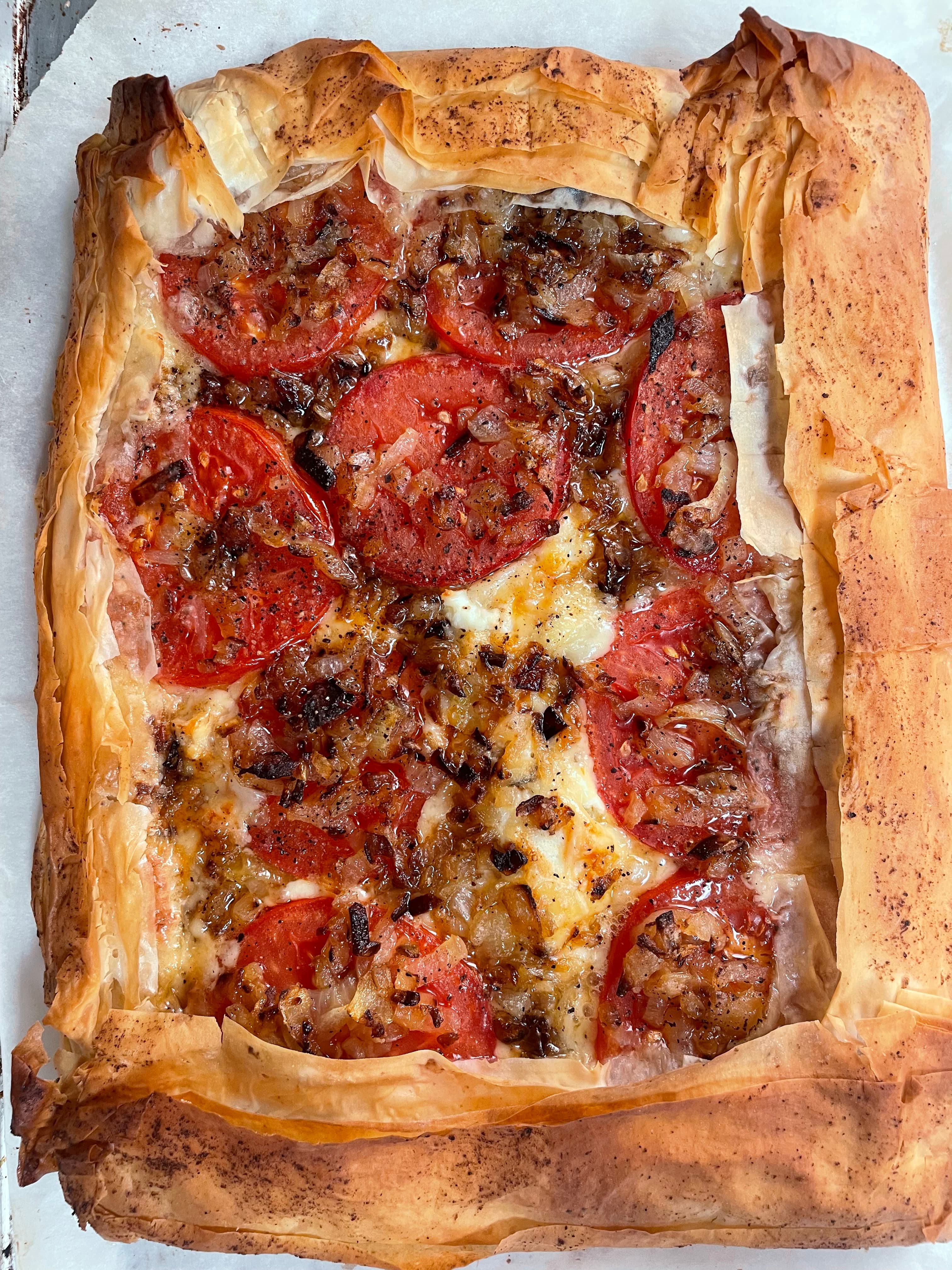 A tomato tart with gruyere, ricotta and onions. My mother had all the ingredients ready to make this when I arrived today, except she had bought phyllo instead of puff pastry. We rolled with it anyway.