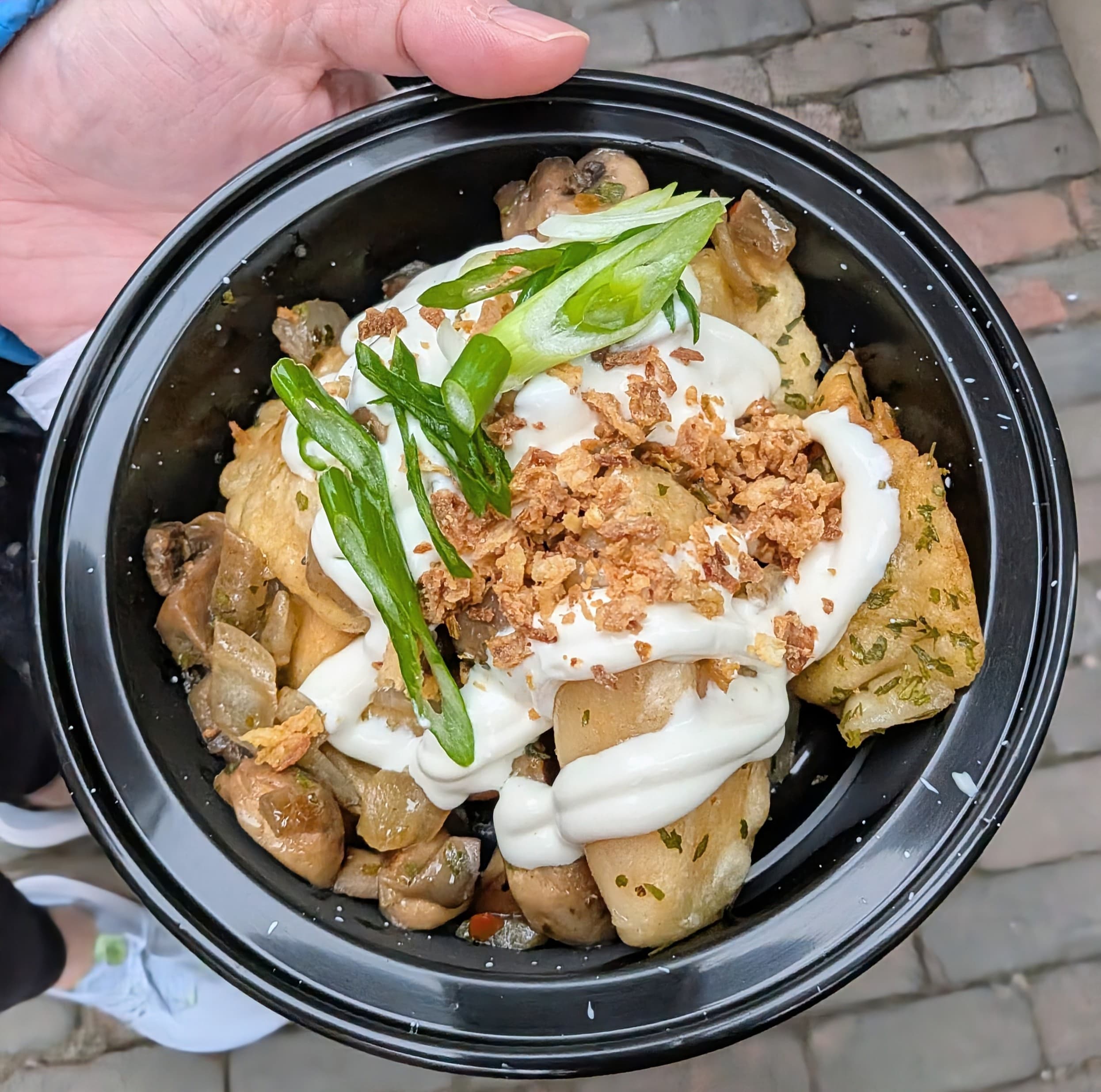 At least the menu of blinged up perogies inspiration, if anyone wanted to make any of these novel perogy preps with better quality perogies and better quality toppings at home.