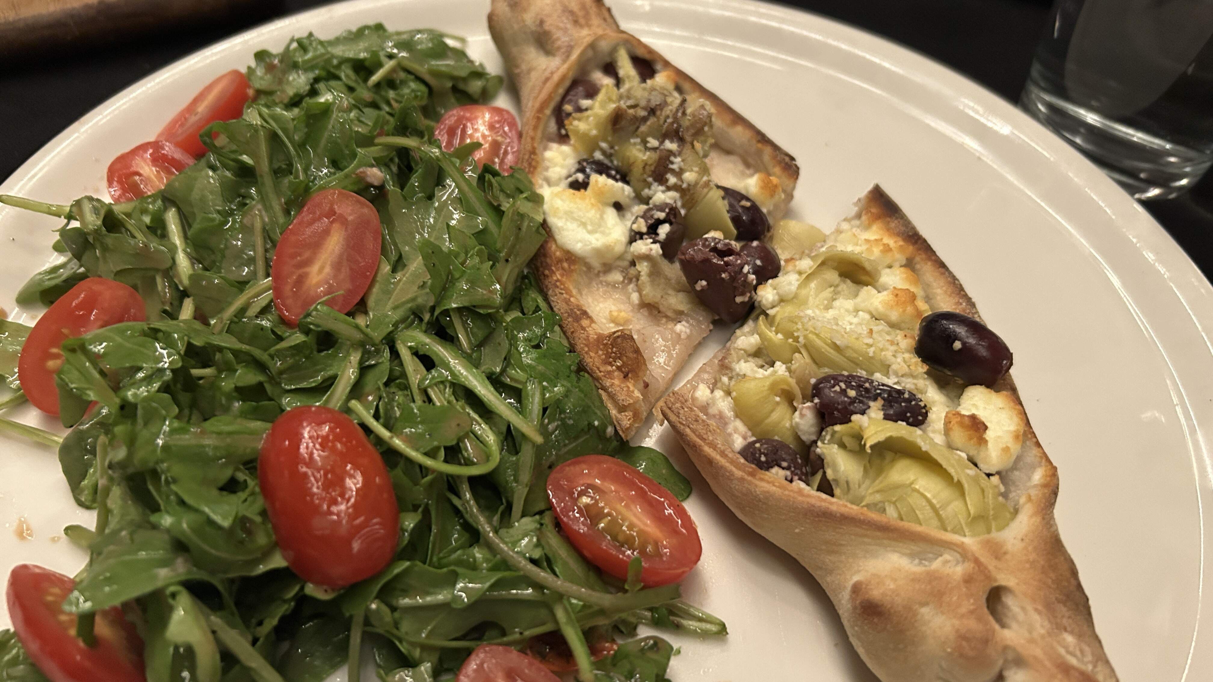 Pictured below is a ‘boat’ with artichoke, olives, and feta. Very well executed, though the dressing on the salad was sweet. Why?