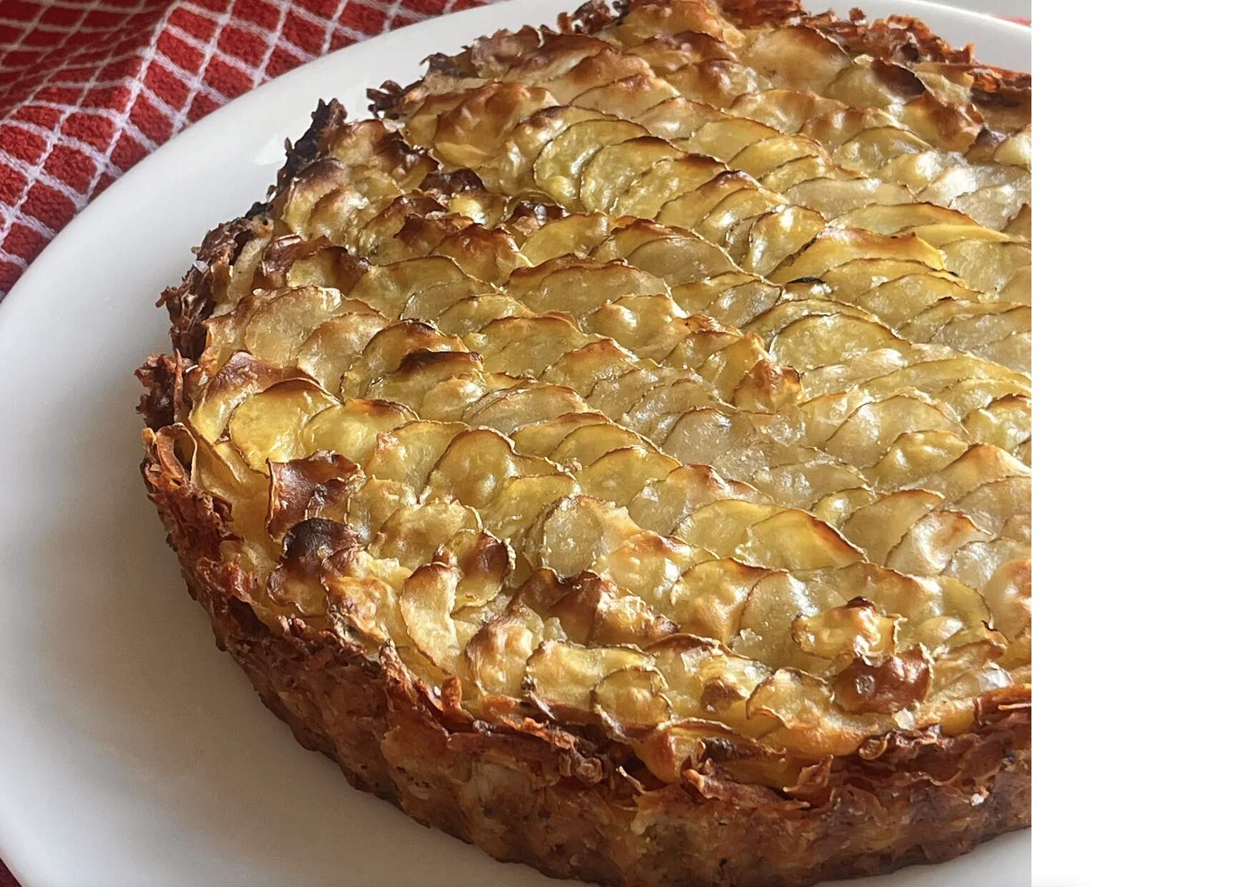 - a potato crust made of rosti potatoes (boiled, grated, blind-baked), into which is spooned