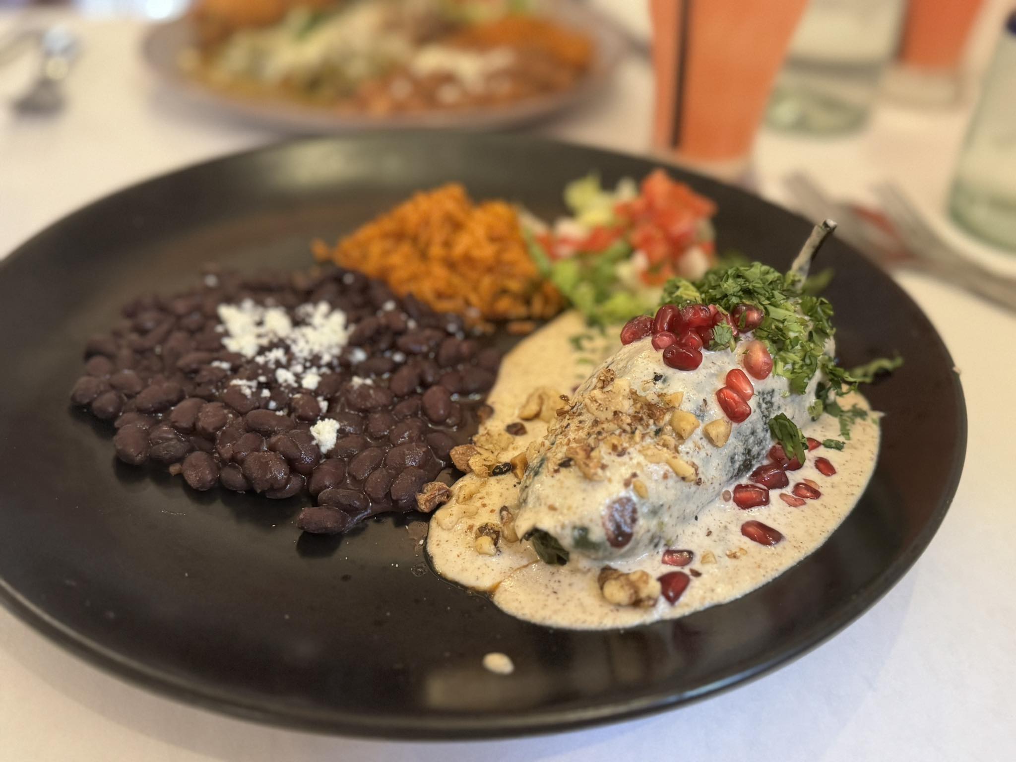 Once we got settled in at our place in Santa Fe (temporarily, it turned out: our Airbnb had mice who got into our snacks and pooped in our luggage while we were at dinner, and we resettled at the Inn of the Governors), we went to Casa Chimayo before catching Wayne’s World at the Jean Cocteau theater. I ordered the chile en nogada, a dish I was familiar with from cooking magazines and whatnot, and from having tried to make it once in my 20s. I don’t know how this version stacks up to others, but I can say it was delicious. Sweet but not too sweet. The beans on the side were not as dry as they look in this photo.