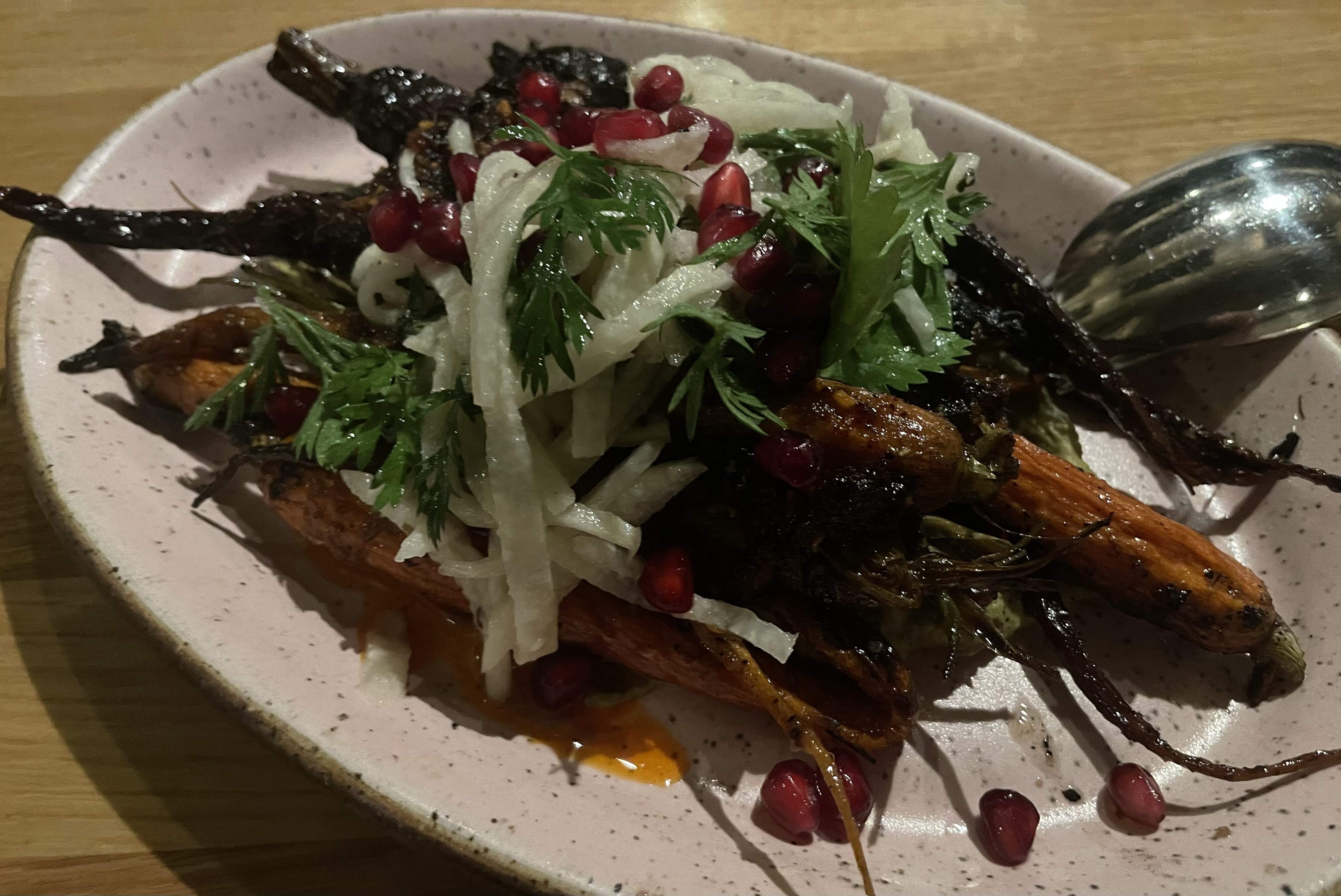 Coal Roasted Carrots, pistachio butter, pickled jicama, cumin, pomegranate, salsa macha