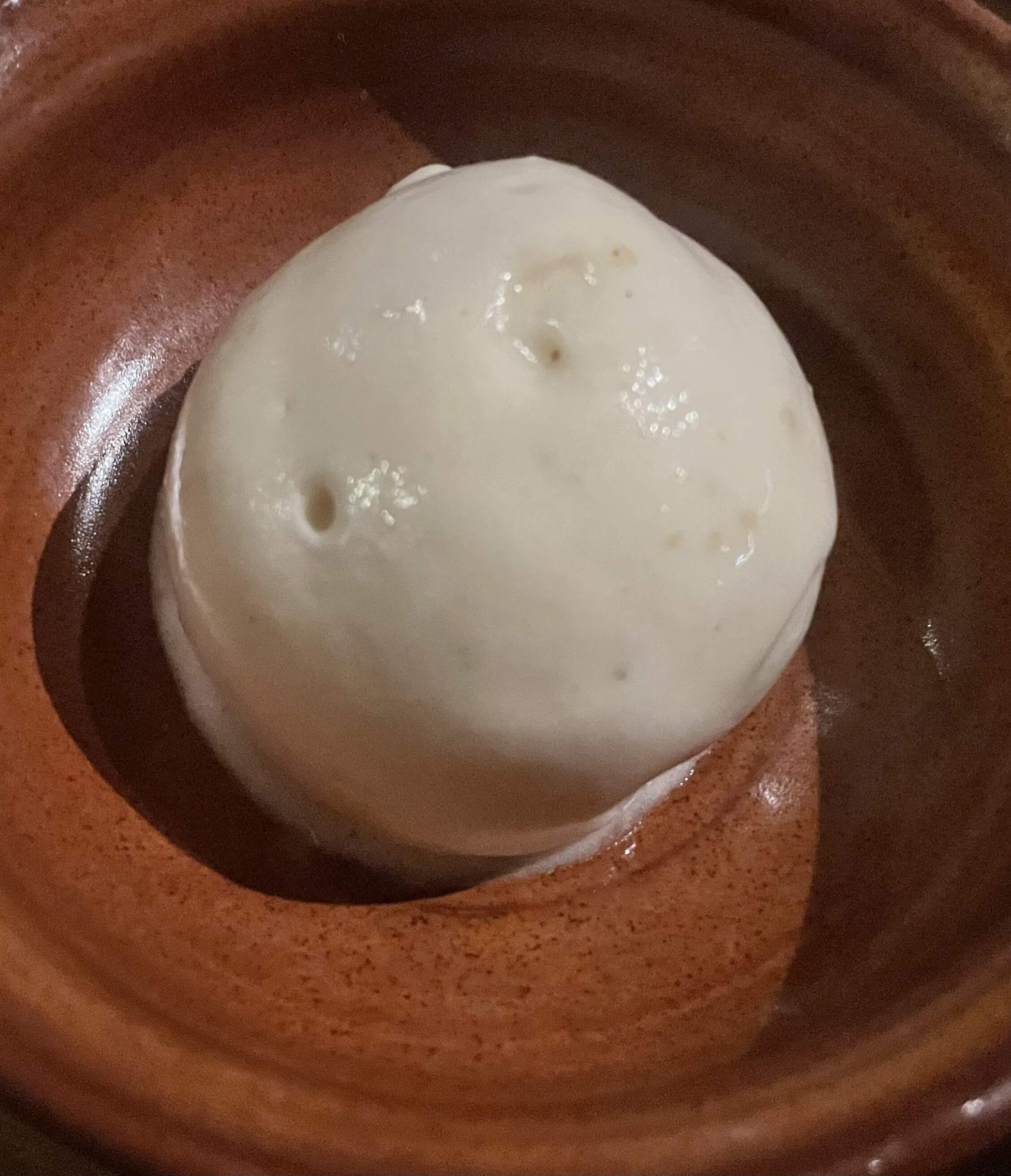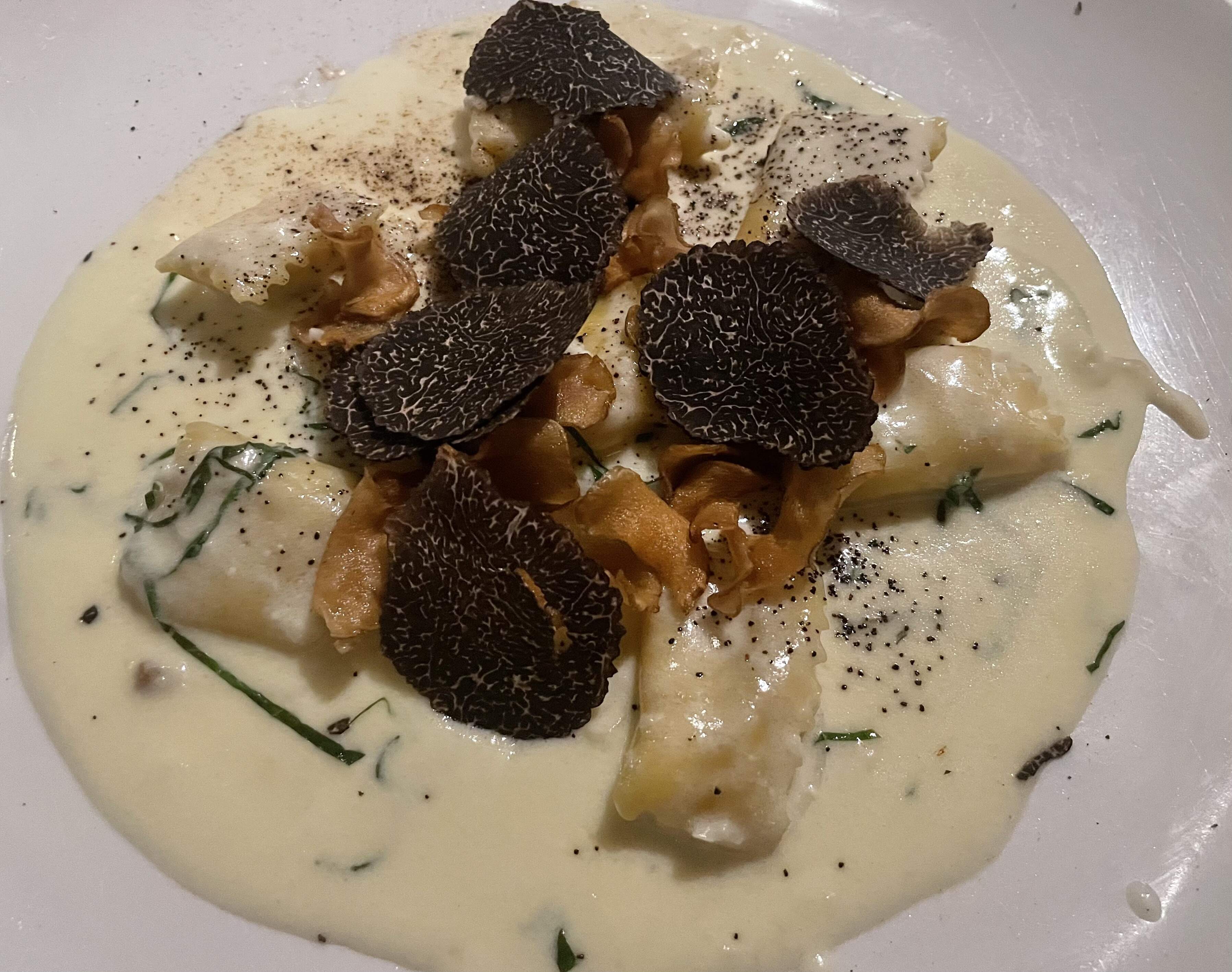 Ricotta Agnolotti, black garlic streusel, black truffle, sunchoke, panna, basil