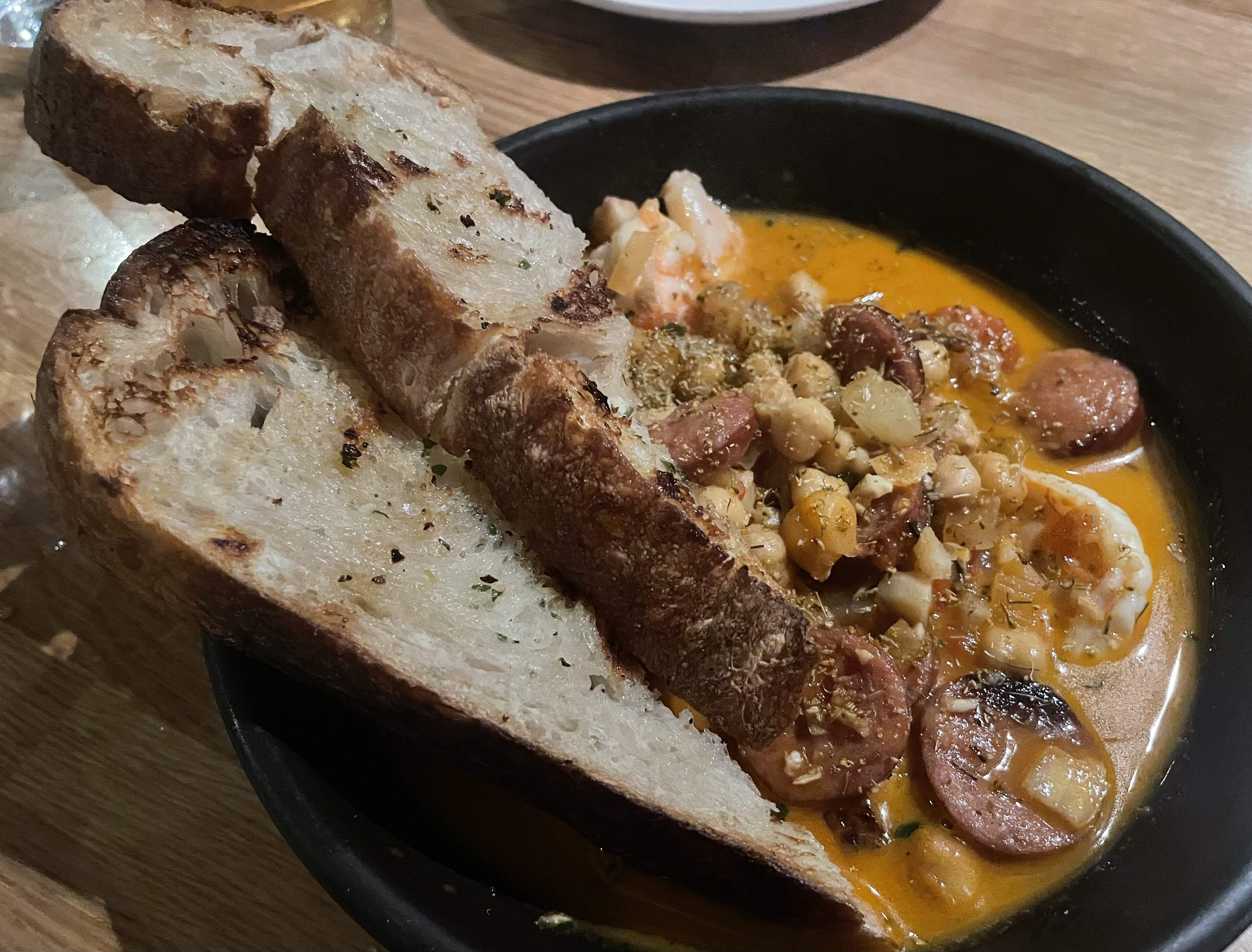 Shrimp + Sausage, andouille, garbanzo beans, tomato, grilled bread