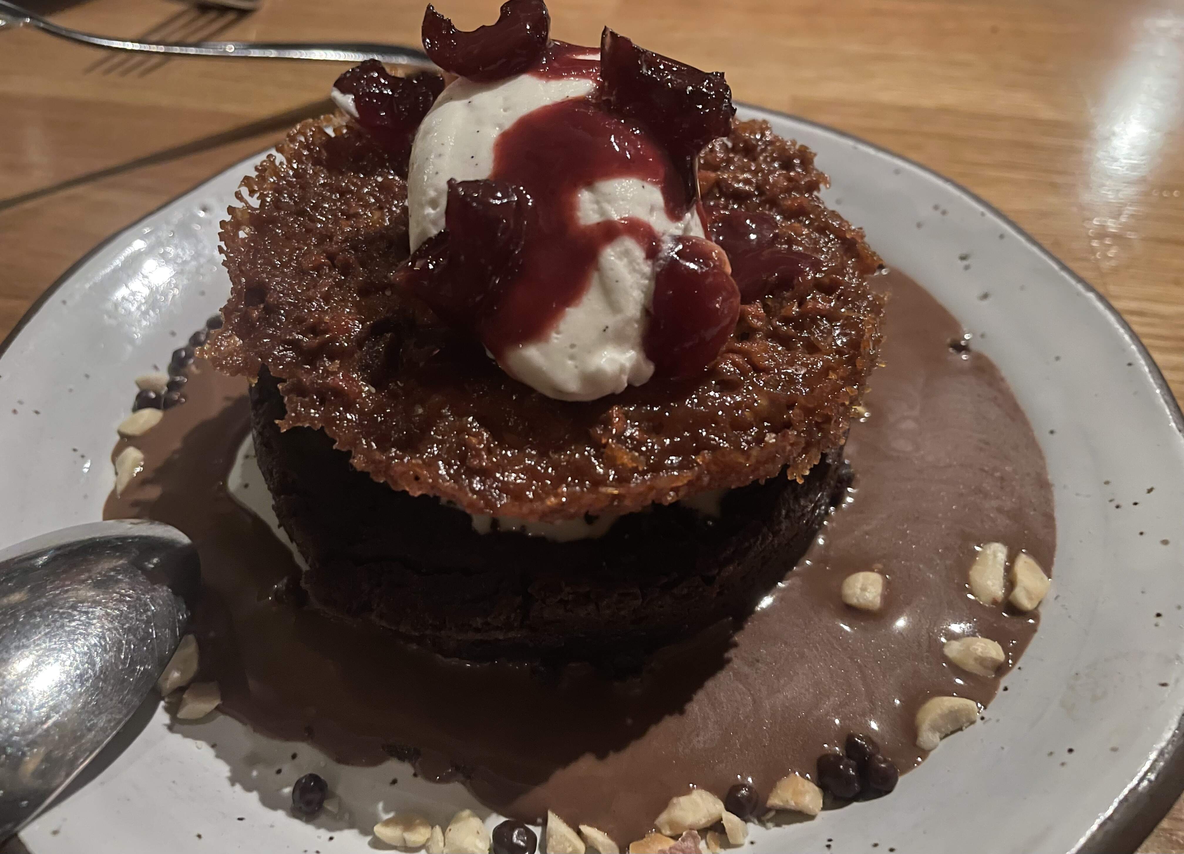 Brownie Sundae Tart, vanilla ice cream, chocolate soup, peanut crisp