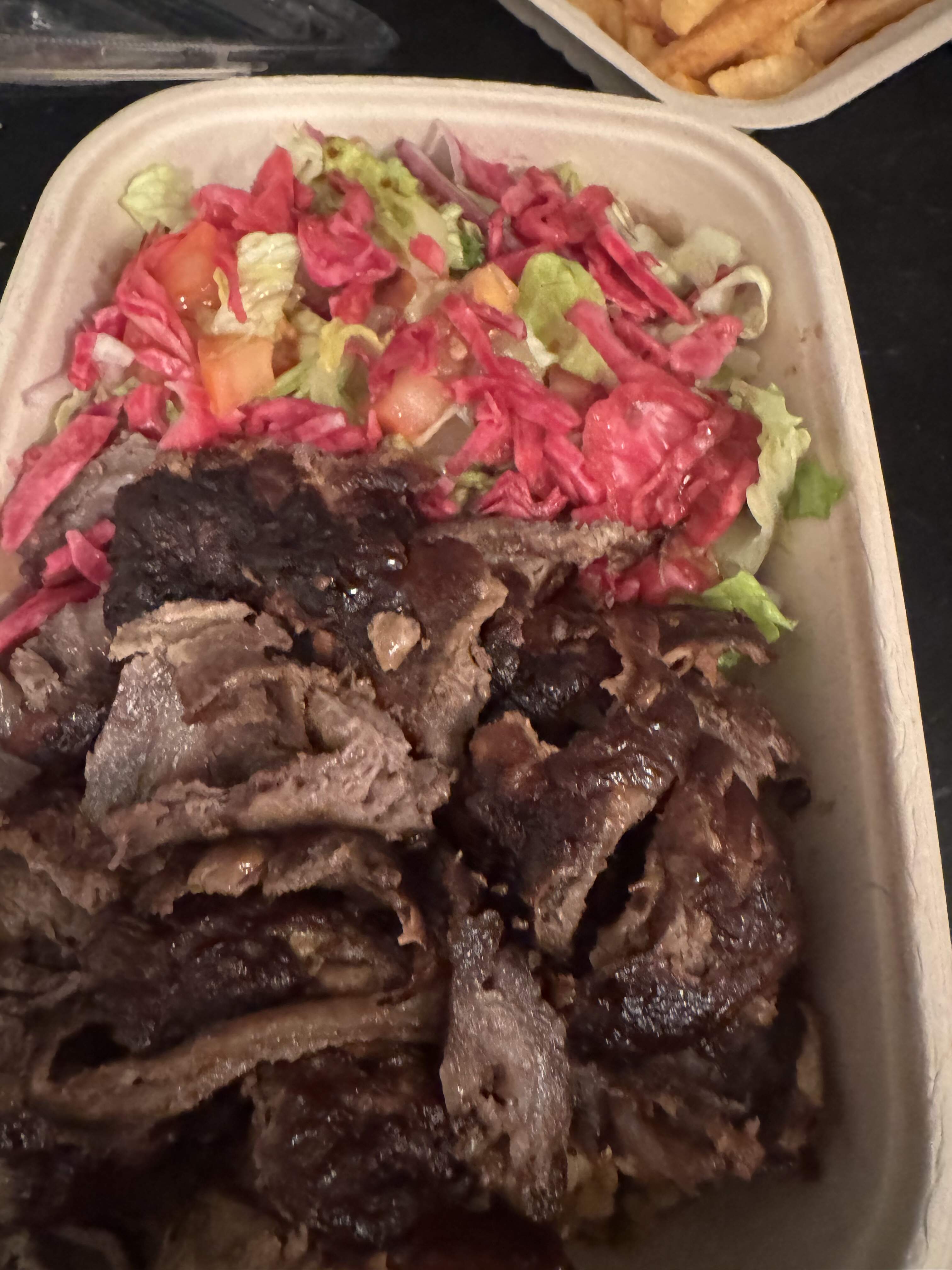 Meat Doner Bowl (Sliced rotisserie beef (80%) and lamb (20%) with rice or bulgur with sumac onions, pickles and greek salad). Sounds beef heavy, but it actually had a deep lamb flavor, which was nice. I also like they give the option of bulgar instead of rice. Really good.