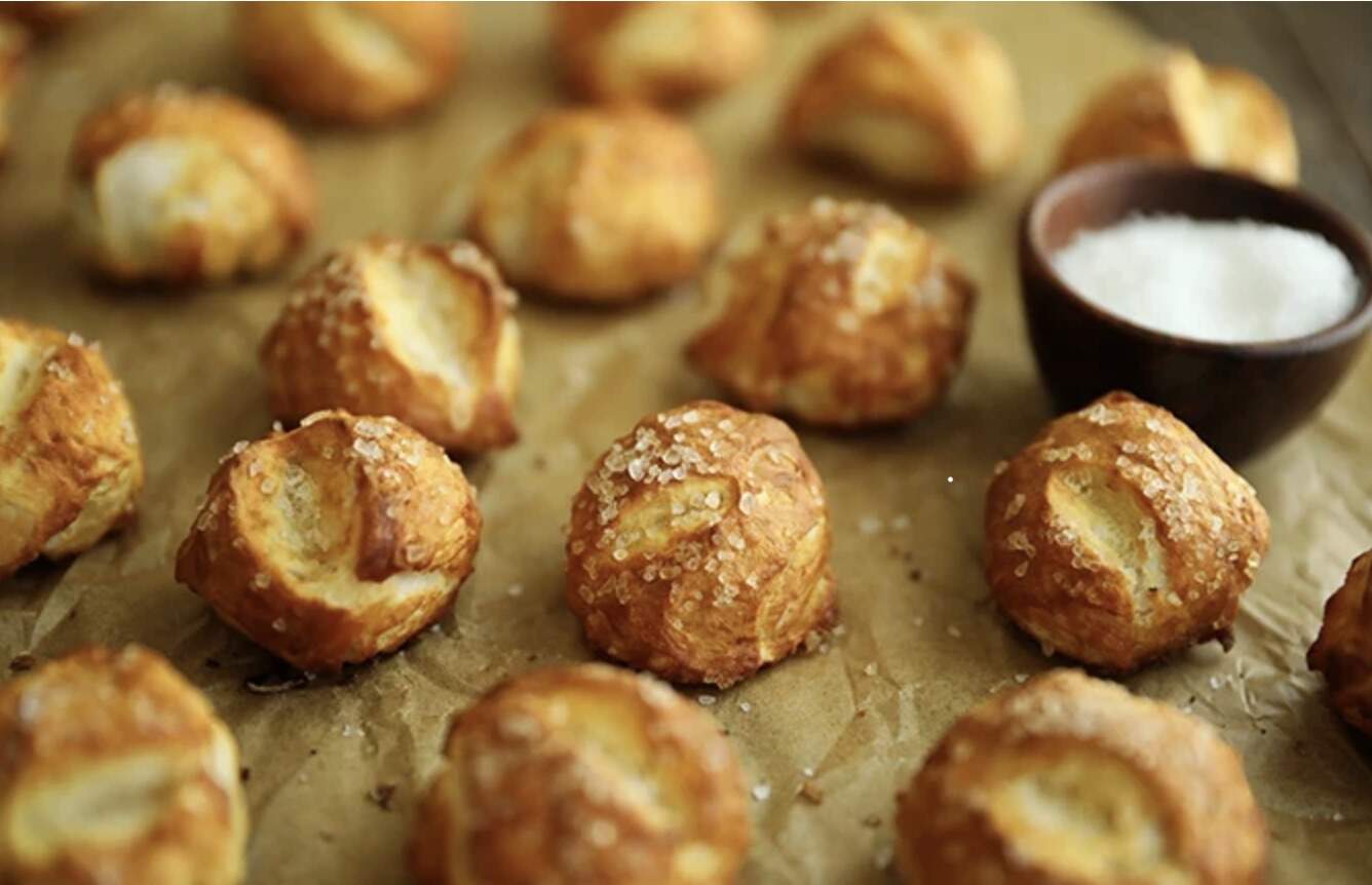 I saw someone demo making these Pretzel Bites out of canned biscuits. Each can makes 32 pieces and it looks like they could be whipped up in an hour or less, which might meet budget and timing requirements.